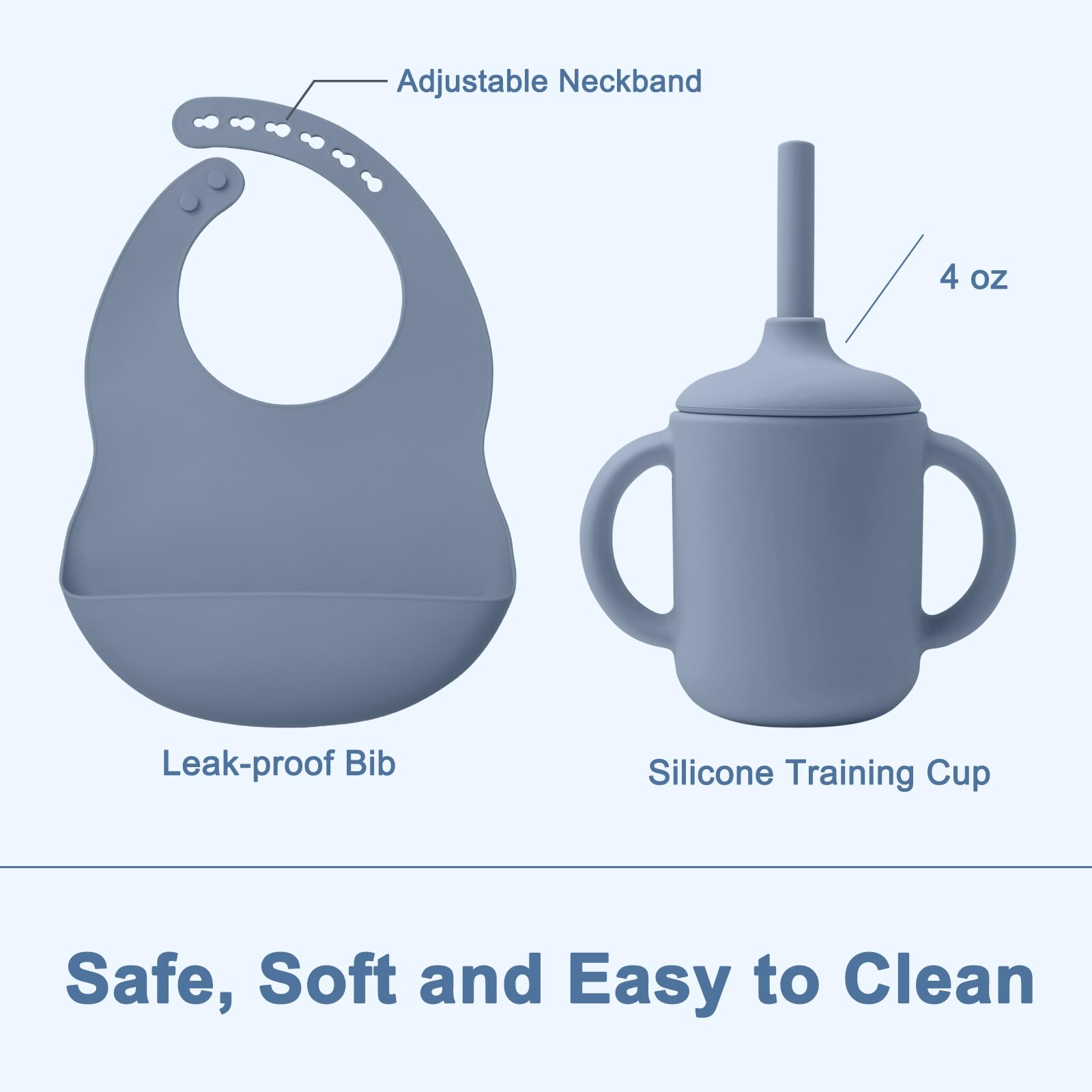 • Baby Led Weaning Supplies: Our silicone bib is designed with a deeper and sturdier pocket, making it highly effective in catching dropped food and easy to clean. The adjustable circular design is particularly gentle on your baby's skin. Our training cup is expertly crafted to fit snugly in your baby's small hands and mouth, safeguarding their developing teeth. Furthermore, the straw is equipped with a spill-proof function, aiding babies in transitioning from breastfeeding and promoting independent drinking.