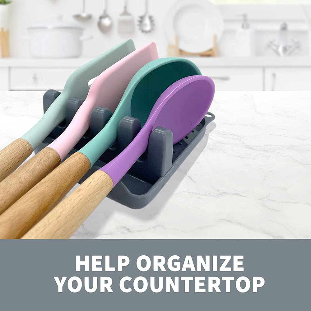 • 🥄A PERFECT PLACE FOR EVERY KITCHEN UTENSIL: Use this stove spoon rest for kitchen utensils, table cutlery, grill tools, kitchen gadgets, and cooking accessories. Lay down the spoon, spatula, ladle, brush, stirrers, tongs, fork, risotto, or whatever you want. Non-slip silicone material provides traction and keeps the spoon balanced and items securely in place. Great for cooking, baking and grilling. Perfect for keeping everything separated when working with different dishes and ingredients.