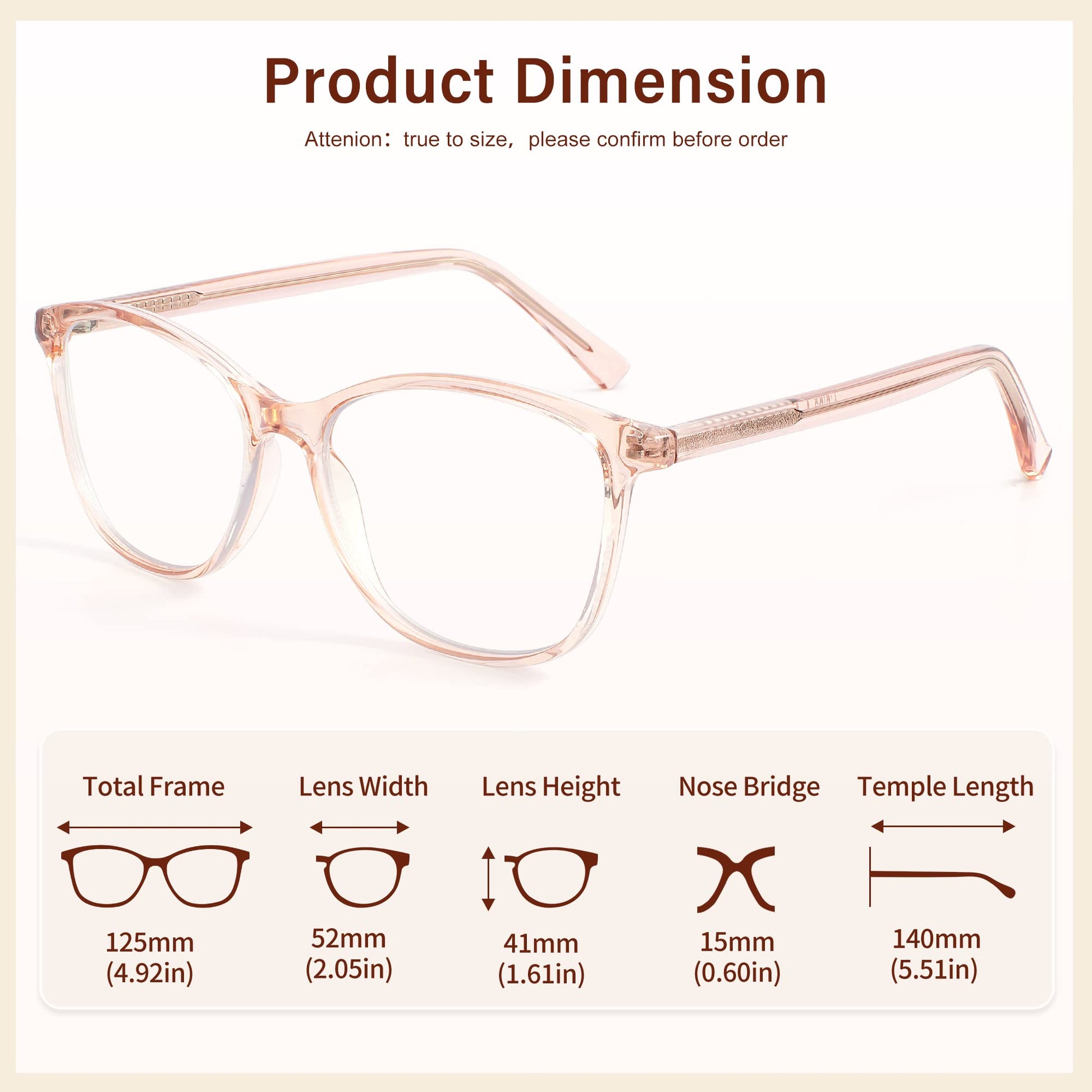 • 【Size】Lens width:52mm(2.05inch),Lens height:41mm(1.61inch), Bridge width:15mm(0.59inch),Arm length:140mm(5.51inch).