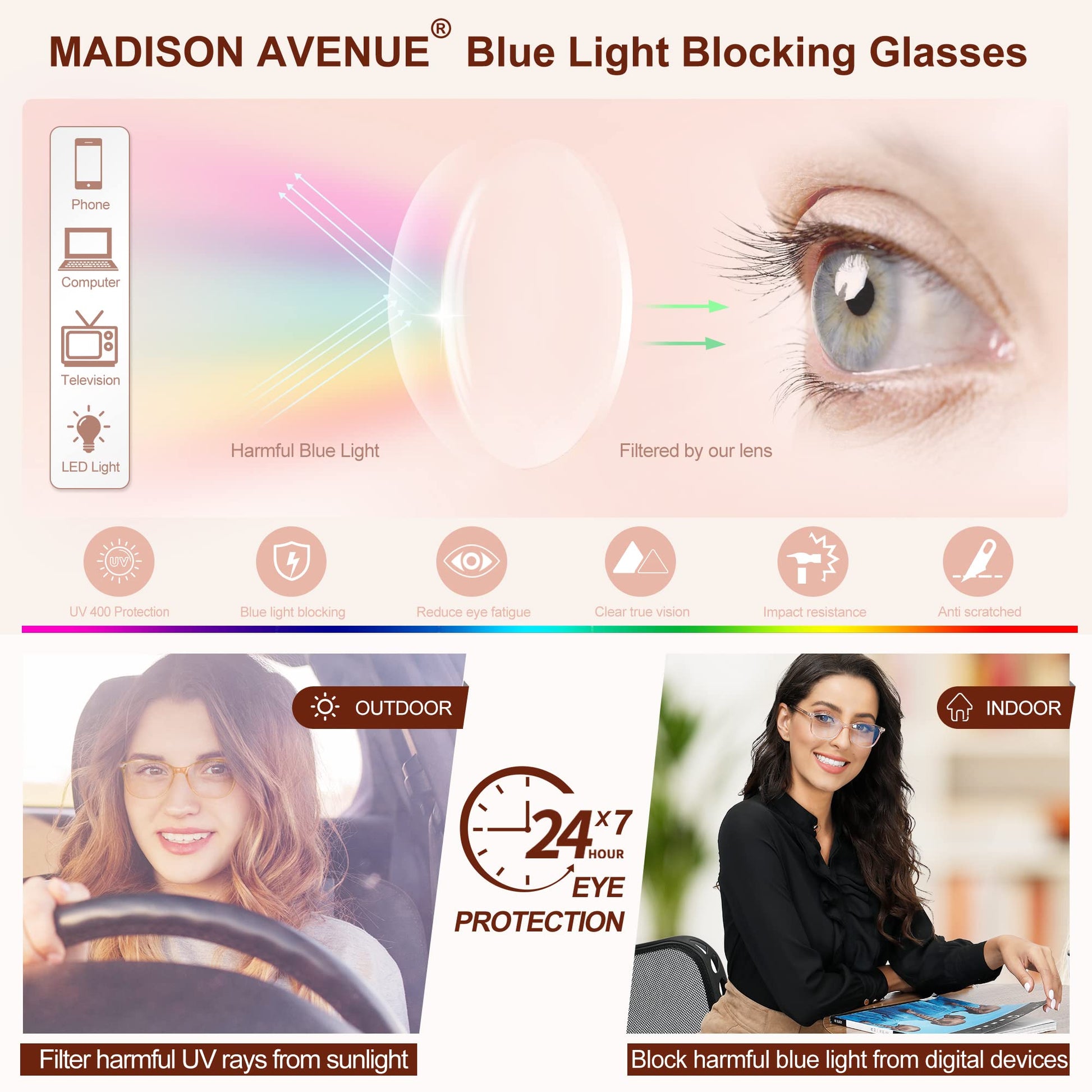 • 【Madison Avenue Blue Light Blocking Lens】 Filter high level blue light from digital screen of computer, phone and TV,maintain HD clear vision with less color distortion.