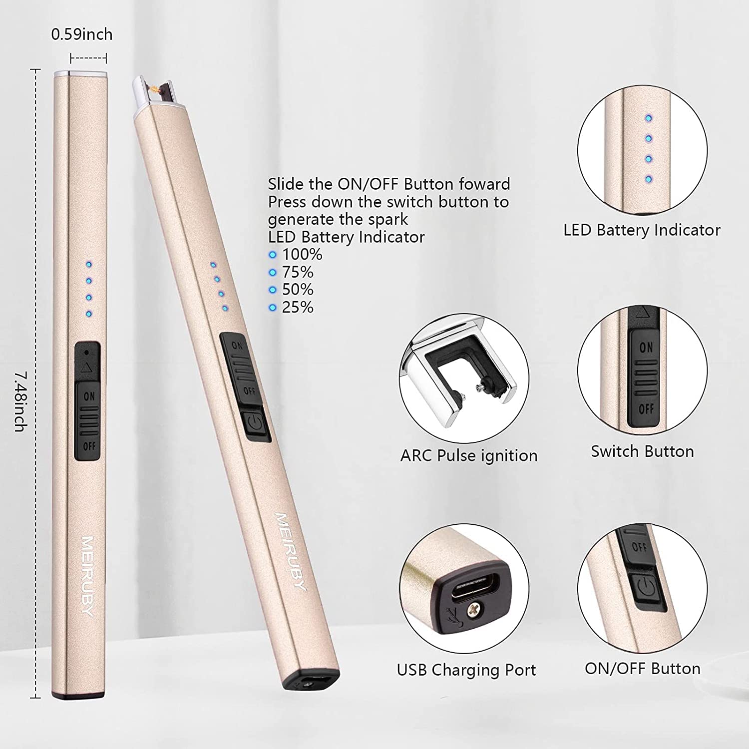 MEIRUBY Lighter Electric Candle Lighter Long Electronic Rechargeable USB Arc Windproof Flameless Lighters for Candle Camping BBQ Birthday Women's Day Gifts for Women Mom Wife Men, Gold
