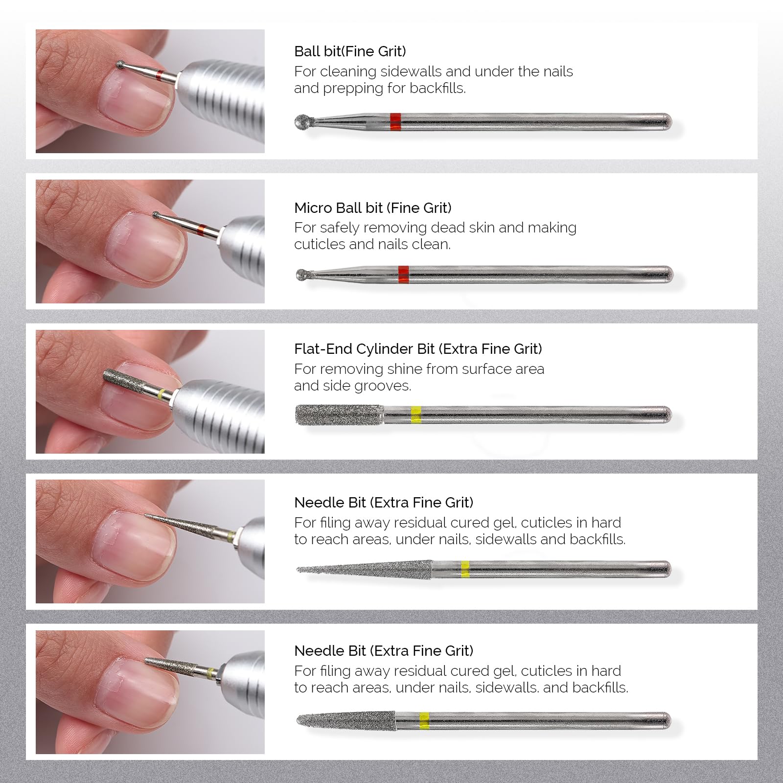 • Professional Diamond Nail Drill Bit: Comes with 9pcs fine grit bits, including flame bit/ nit bit/ safety bit/ small cylinder bit/ ball bit/ micro ball bit/ flat-end cylinder bit/ needle bits/ clean brush, this nail set works great for under nails cleaning, hard skin cleaning, cuticle removing. With a well-made case for storage and dust-proof, helping you figure out the desired bits quickly.