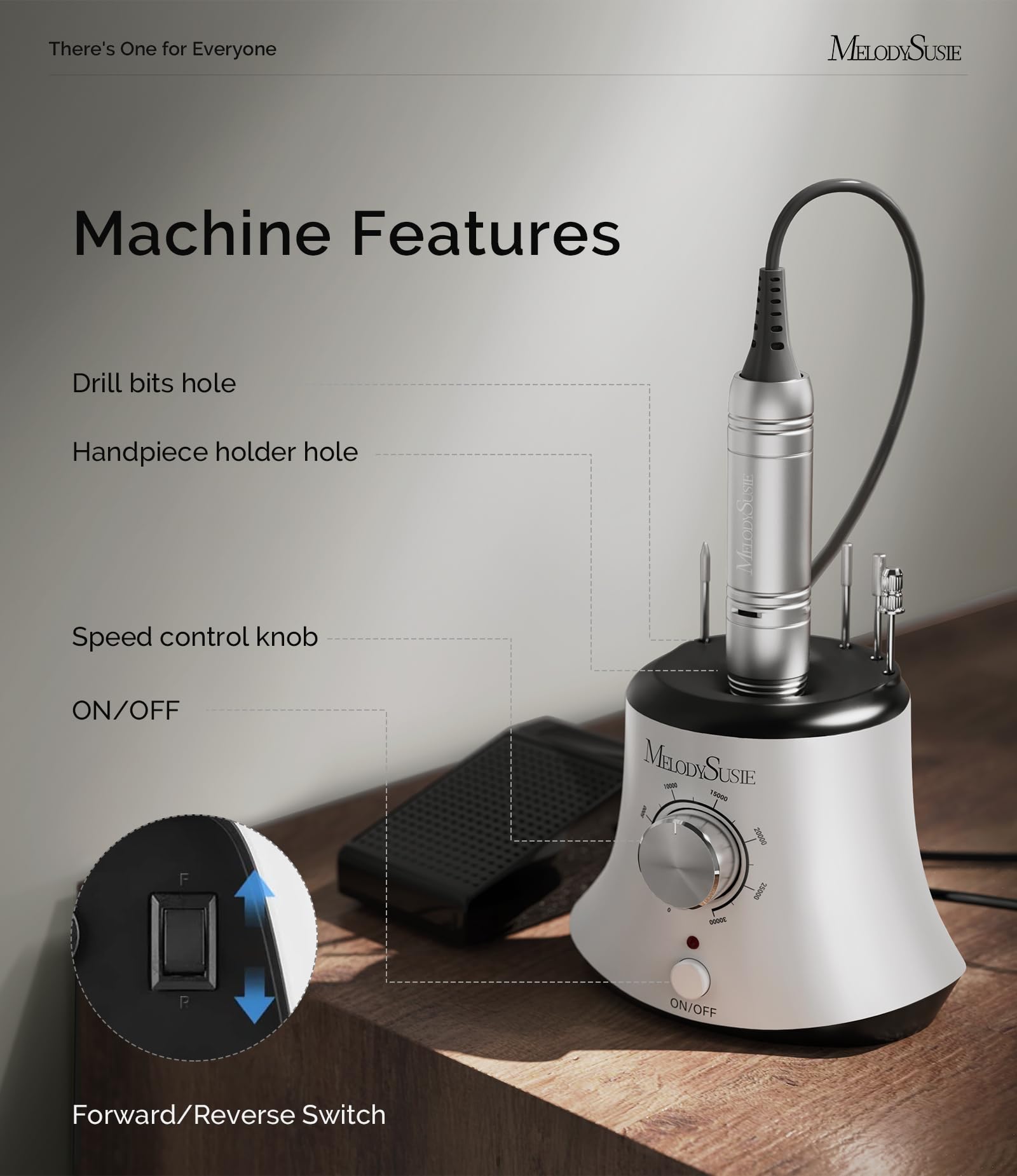 • Professional Appearance: This electric nail drill comes with a Bit holder on it to let you have your favorite pieces at your convenience, and the handpiece fits in the center of the drill. Saving space on your desk. Ensures low heat, low noise, and low vibration.