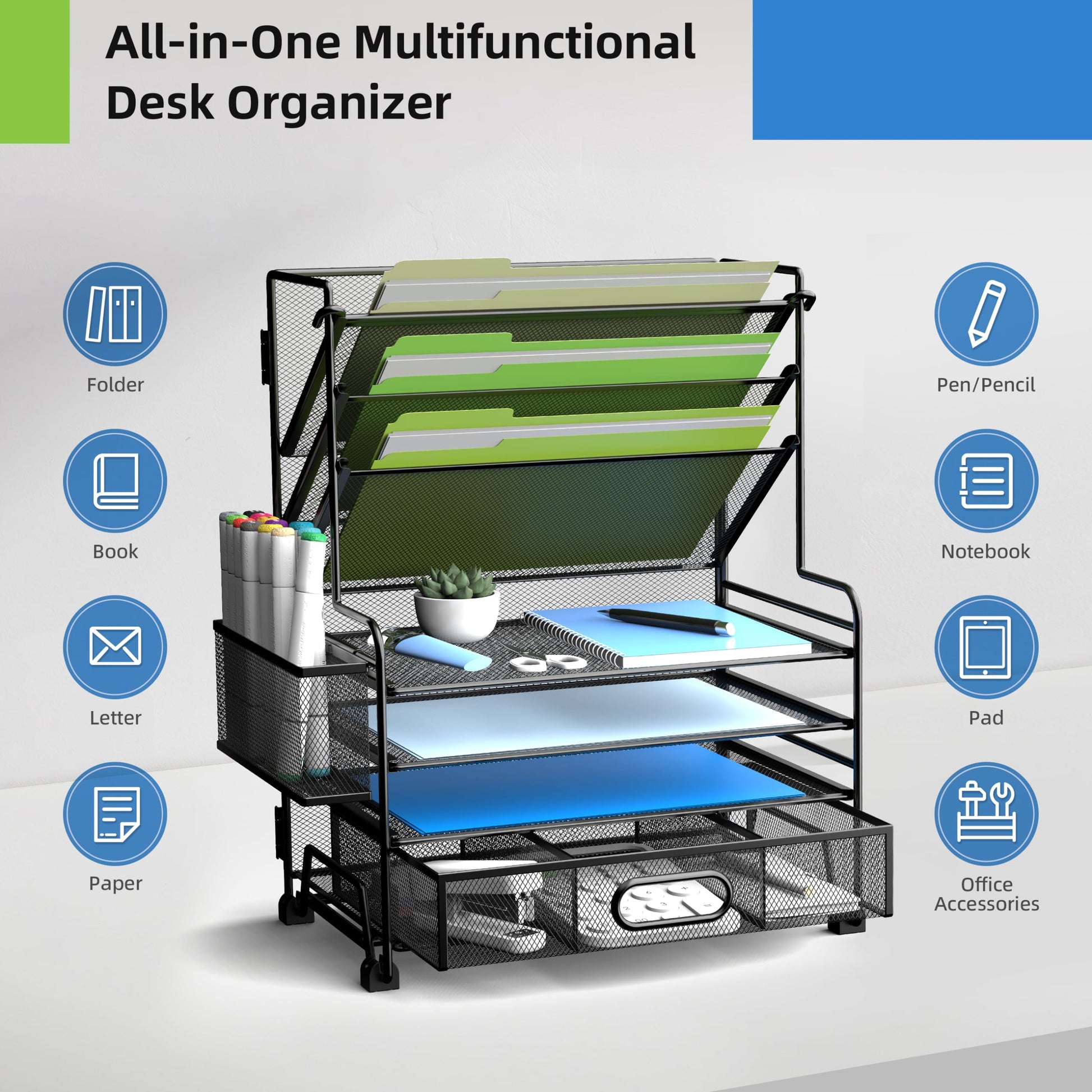 MINDEPOT 4-Tier Paper Organizer + 3-Pocket File Holder + Drawer + Pen Holders, Desktop File Organizers Paper Tray for Office Accessories School Classroom Organization (Black)