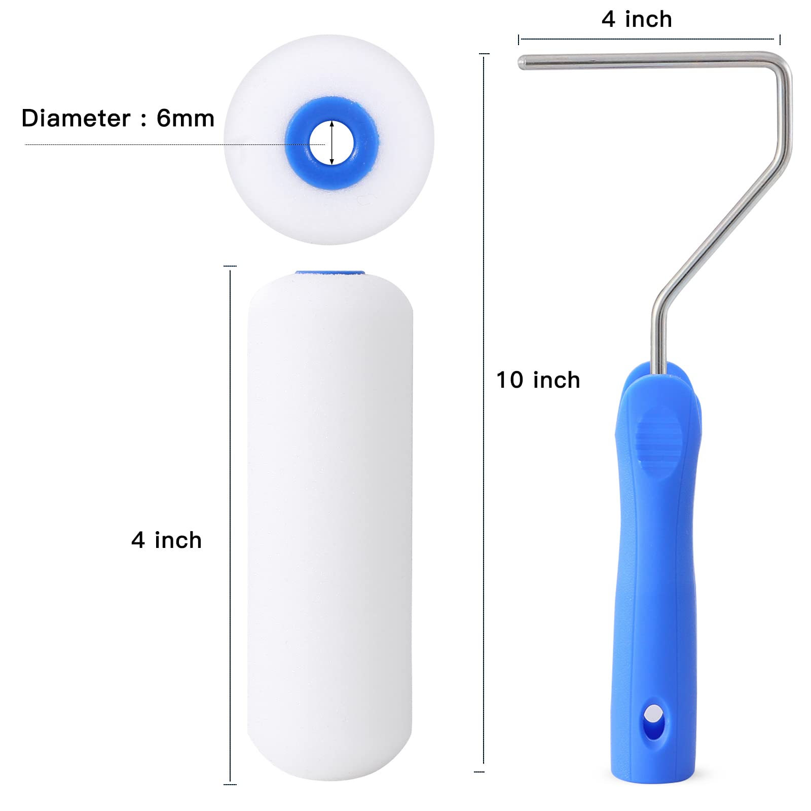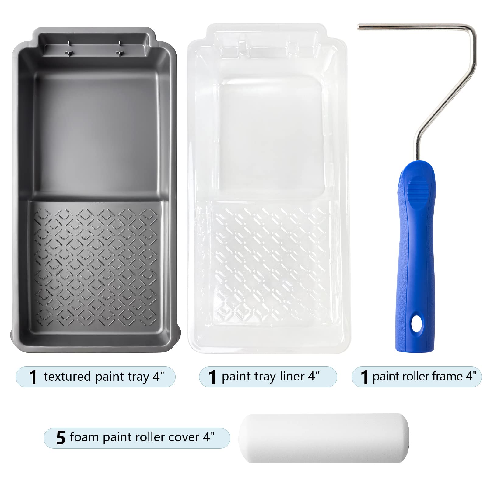 • Foam Paint Roller Kit: 4 Inch high density foam paint roller cover 5 pcs, 4 inch paint tray, 4 inch paint tray liner, 4 Inch paint roller frame