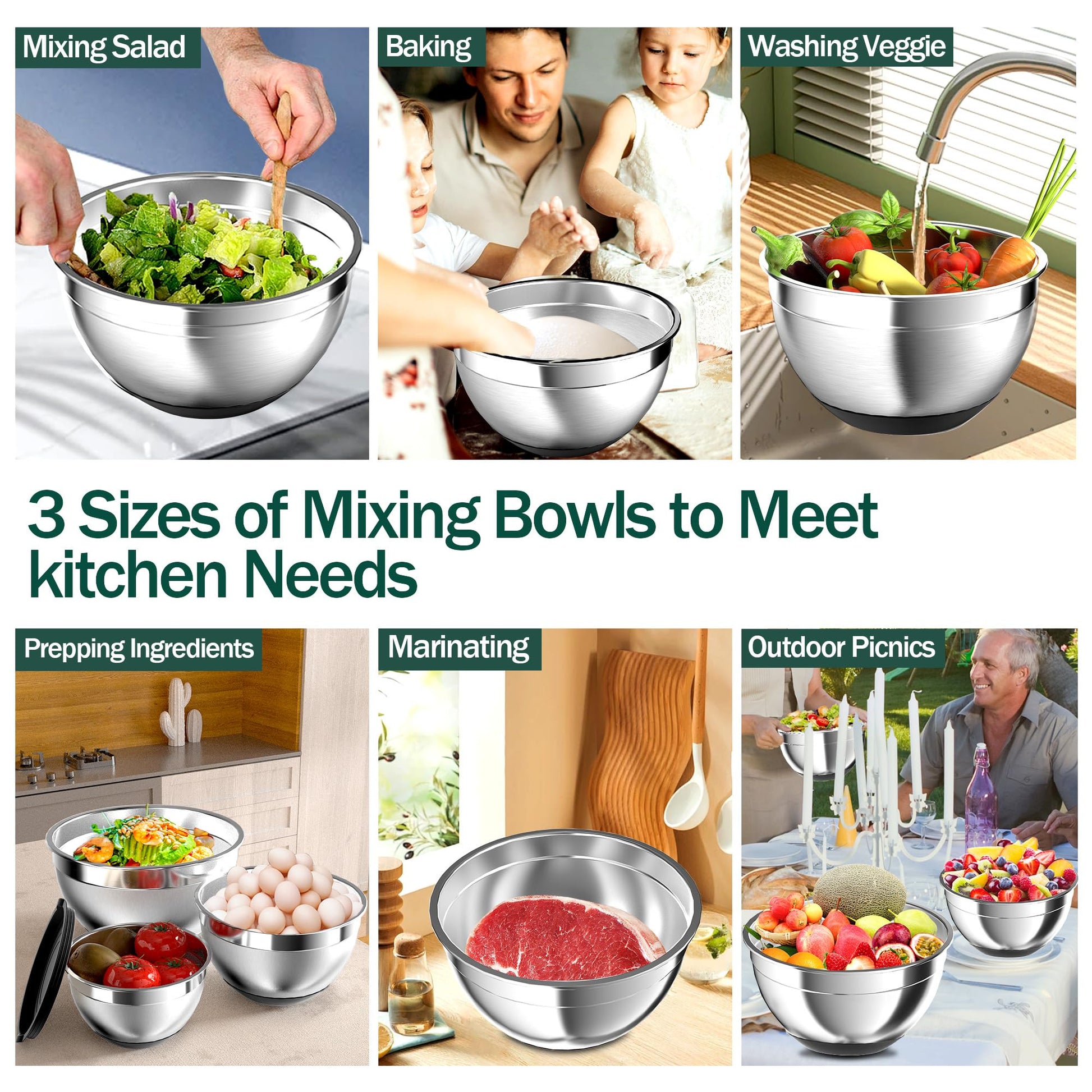 • 【Stainless Steel Material】: Our cooking utensils nesting mixing bowls are made of heavy-duty stainless steel, corrosion-resistant, rust-proof, and do not produce spots. The mixing bowl stainless steel adopts mirror polishing technology and smooth finish. The kitchen accessories are perfect for everyday use, such as making quick salads, prepping meals, mixing batters or storing and marinating foods.