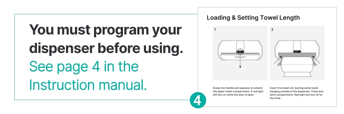• SET UP IS IMPORTANT. Follow the instructions provided in the manual or on the video to dispense one full sheet or one half sheet of paper towel for best results.