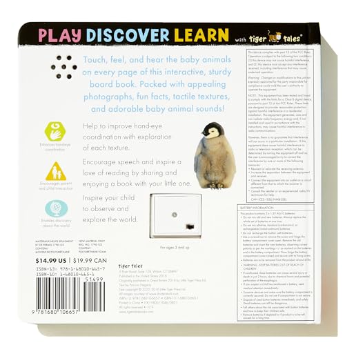 Details: Young readers will love to feel the different textures and hear the baby animal sounds in this interactive, sturdy board book designed for children ages 3 and up. Includes an on/off switch on the back cover to extend battery life.