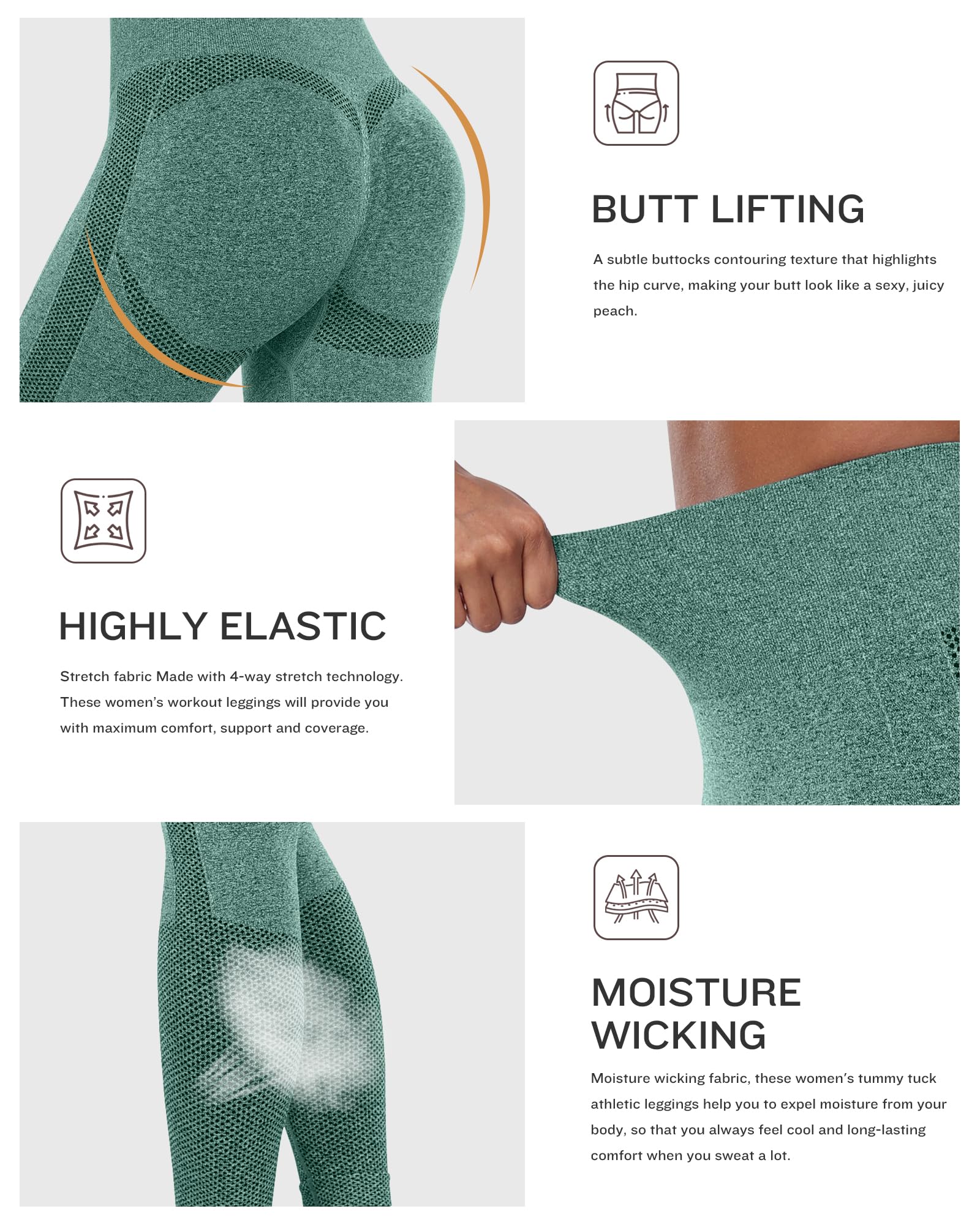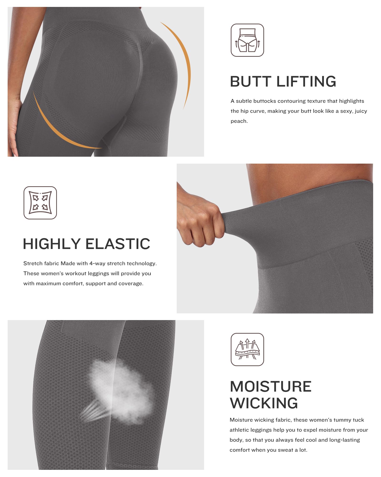 • 🍑Butt Lifting & Squat Proof - Seamless Workout Butt Lifting Leggings feature a subtle buttocks contouring texture that highlights the hip curve, making your butt look like a sexy, juicy peach. The unique smile contour design on both sides of the butt enhances your natural shape, offering total coverage without any see-through issues, even during intense squats and bends