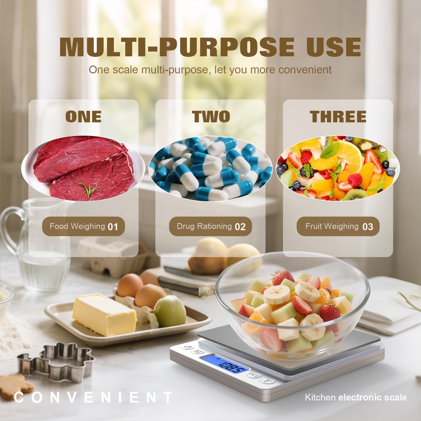 • Practical Tray: Our gram scale comes with a detachable tray that doubles as a protective cover, saving valuable space. It's also easy to measure directly without a bowl. Perfect for baking, cooking, or fitness, choose this scale to make your kitchen work and life more efficient