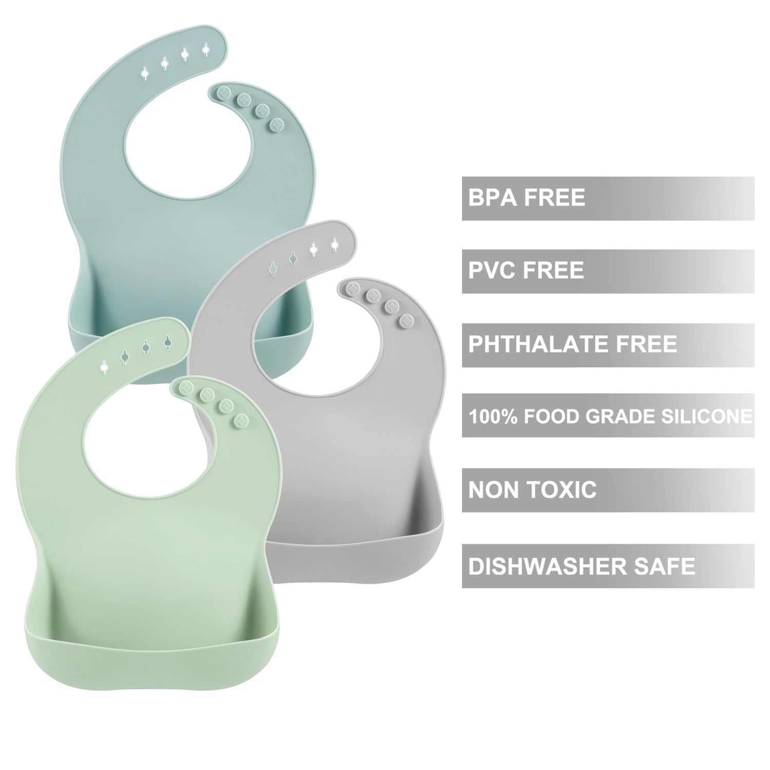• [ 100% SOFT SILICONE ] - Our 3 pack thick baby eating bibs are made of 100% soft silicone and will help cut down on your laundry.