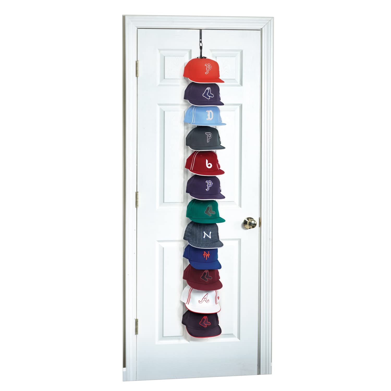 • HANG OVER A DOOR, IN THE CLOSET AND MORE: Place the cap rack almost anywhere in your house, dorm or wherever you keep your collection. It comes with an over-the-door hook that fits doors 1.5” to 1.75” in thickness. Also place on a wall or from the ceiling like a mobile.