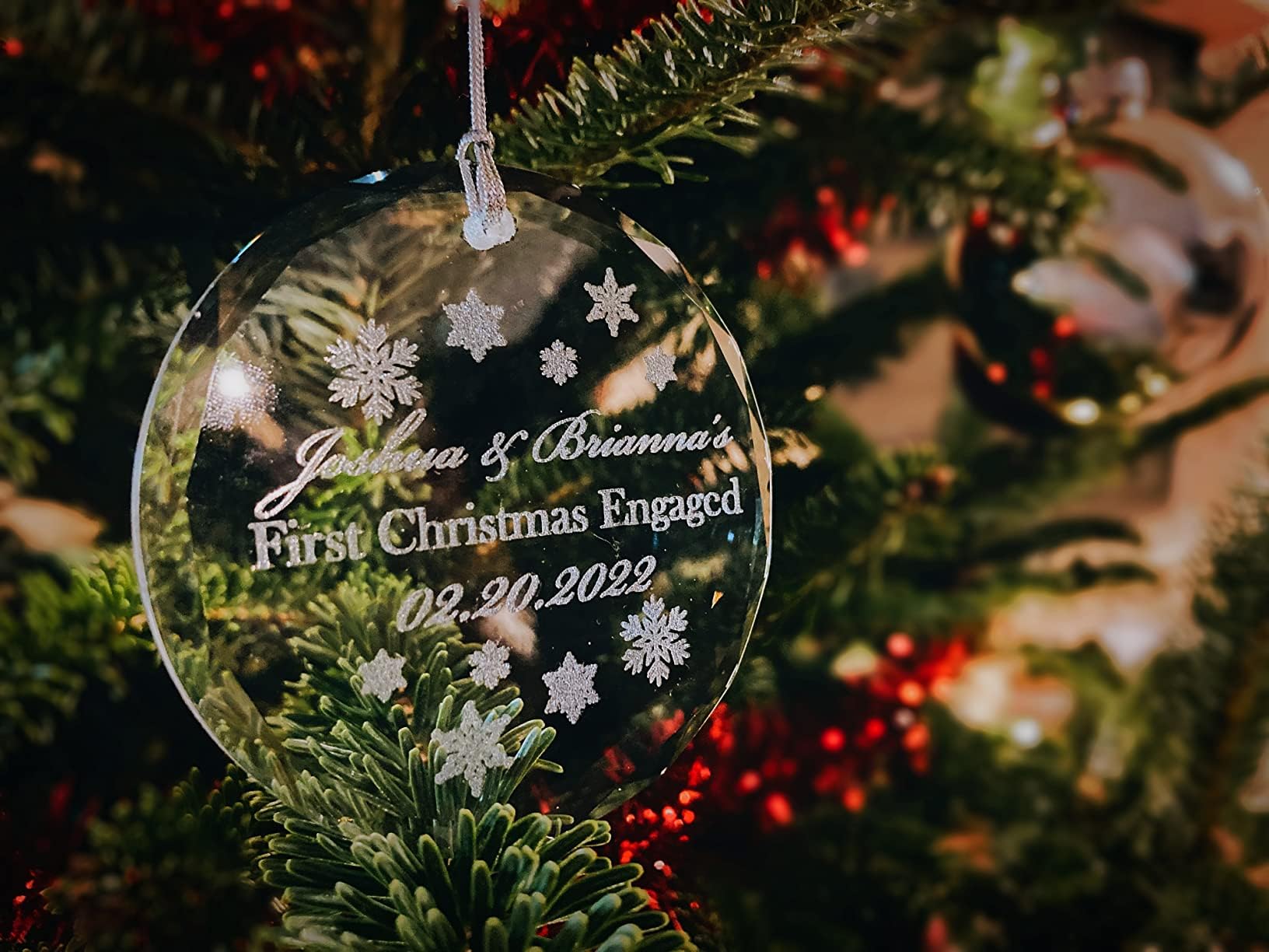 • Personalized Keepsake Ornament: Round crystal ornament approximately 3″ in diameter, customized with name(s) and year to mark a first Christmas for a baby, couple, or family.