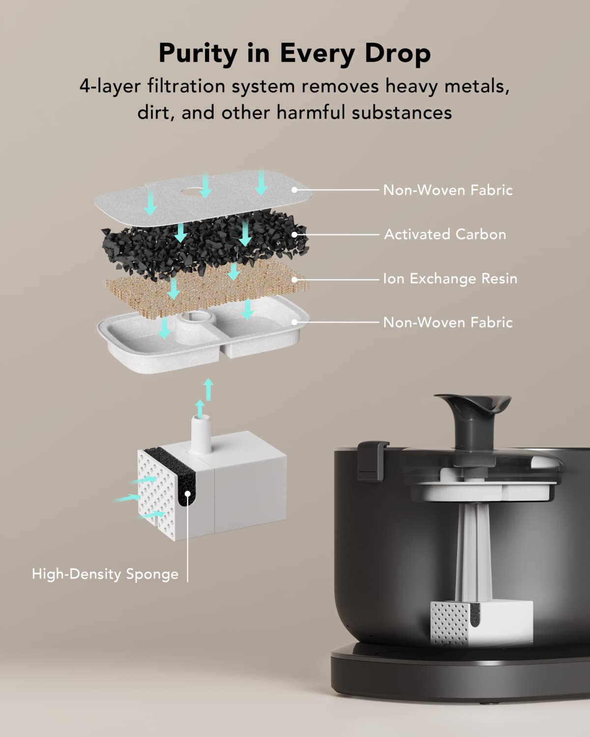 • Freshness in Every Sip - Every drop of water is filtered through vertical filtration system to remove all impurities and provide oxygen-enriched and better-tasting water. 1. Ion exchange resin removes heavy metal ions. 2. Activated carbon removes foul odors. 3. Non-woven fabric captures impurities. 4. High-density sponge further filters debris and prevents blockages while taking the pump lifespan of the cat water dispenser to the next level.
