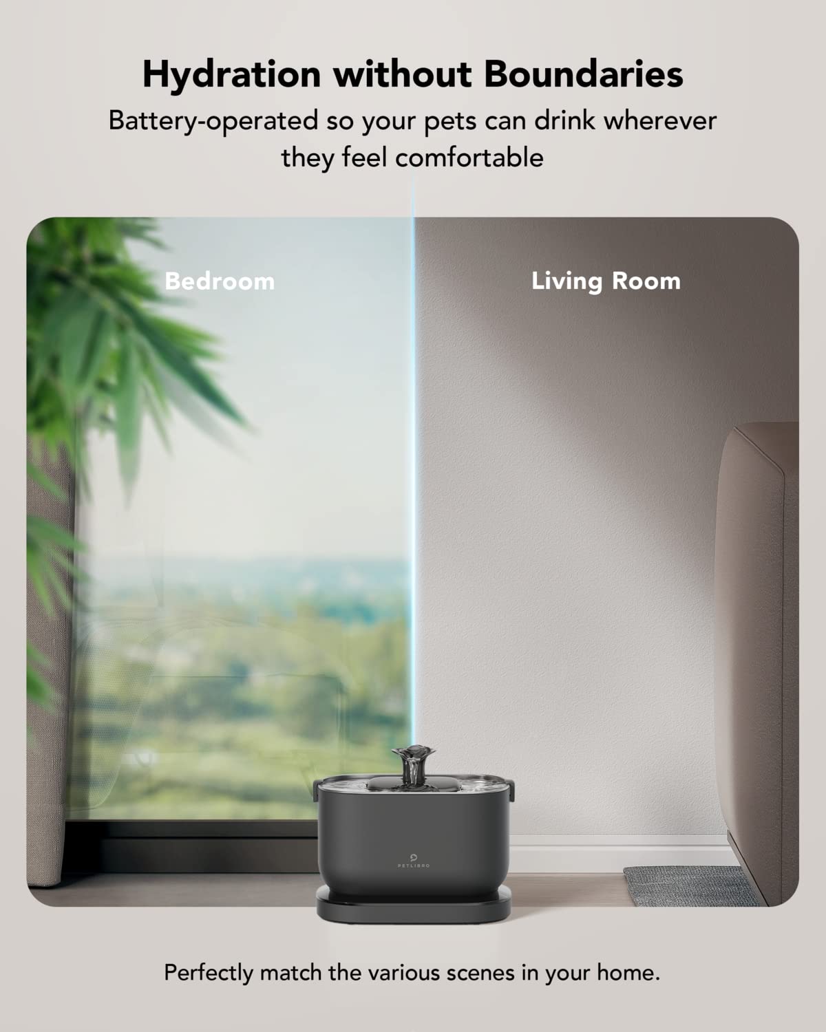 • Exceptional Battery Life - Powered by 5,000mAh built-in rechargeable battery, the PETLIBRO wireless cat water fountain with stainless steel tray delivers fresh, clean water on a full charge. It will keep your pets well-hydrated even during power cuts or when you take short trips.