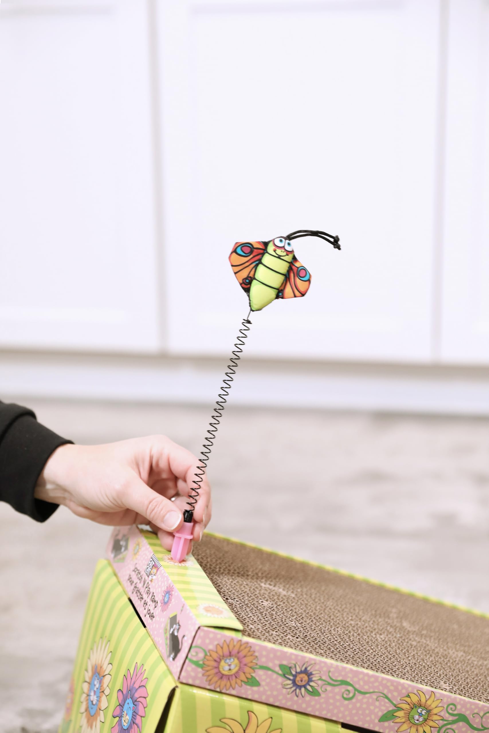 Featuring Zoom Around the Room catnip, the cat scratch box attracts your cat to the box for hours of stimulating play. The attached corner tassels of the cat scratcher toy provide extra entertainment for cats when scratching. As an added bonus, the included Catnip Cat Toy provides cats with an additional playtime outlet . The box's 100% recyclable cardboard material is reversible for double the fun.