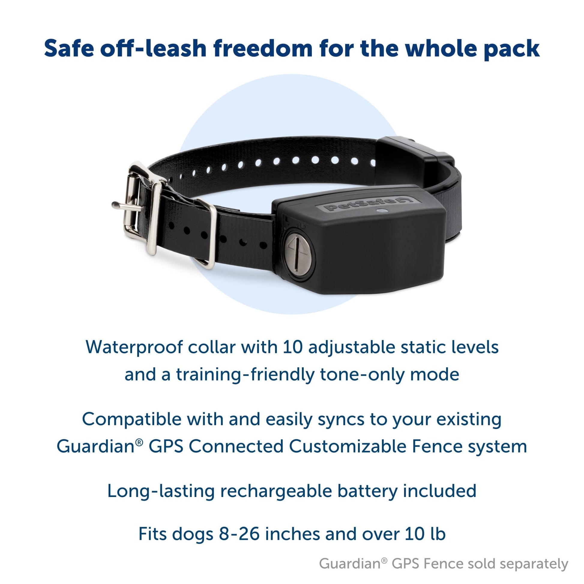 Details: Looking for an extra collar for your Guardian GPS Connected Customizable Fence? Weve got you (and your four-legged friends) covered with the Guardian GPS Add-A-Dog Collar! Boasting a 3-day battery life, you can count on this waterproof collar to always be ready for your dogs next trip outside. Connecting your collar to your existing Guardian GPS Fence is easy and is done within the My PetSafe app, where youll also be able to monitor and customize settings. With 10 static levels and a training-friendly tone-only mode, your dog can learn their new boundaries in as little as 2 weeks. Have peace of mind knowing this collar is equipped with AccuGuard the worlds most reliable GPS fence technology. AccuGuard combines GPS data with real-time motion detection, ensuring consistent training and a stable boundary that you can rely on day and night. Your pet deserves the best. Trust PetSafe to keep your pet healthy, safe and happy.