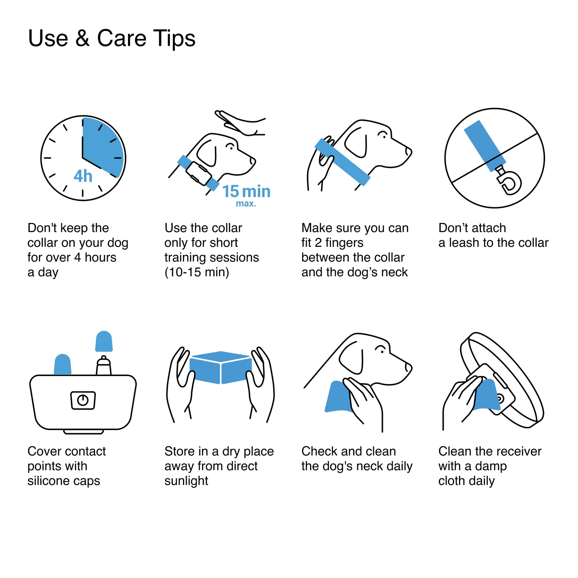 • 4 training modes: continuous shock, 1 sec shock, vibration, and a beep trainer with 8 adjustable levels