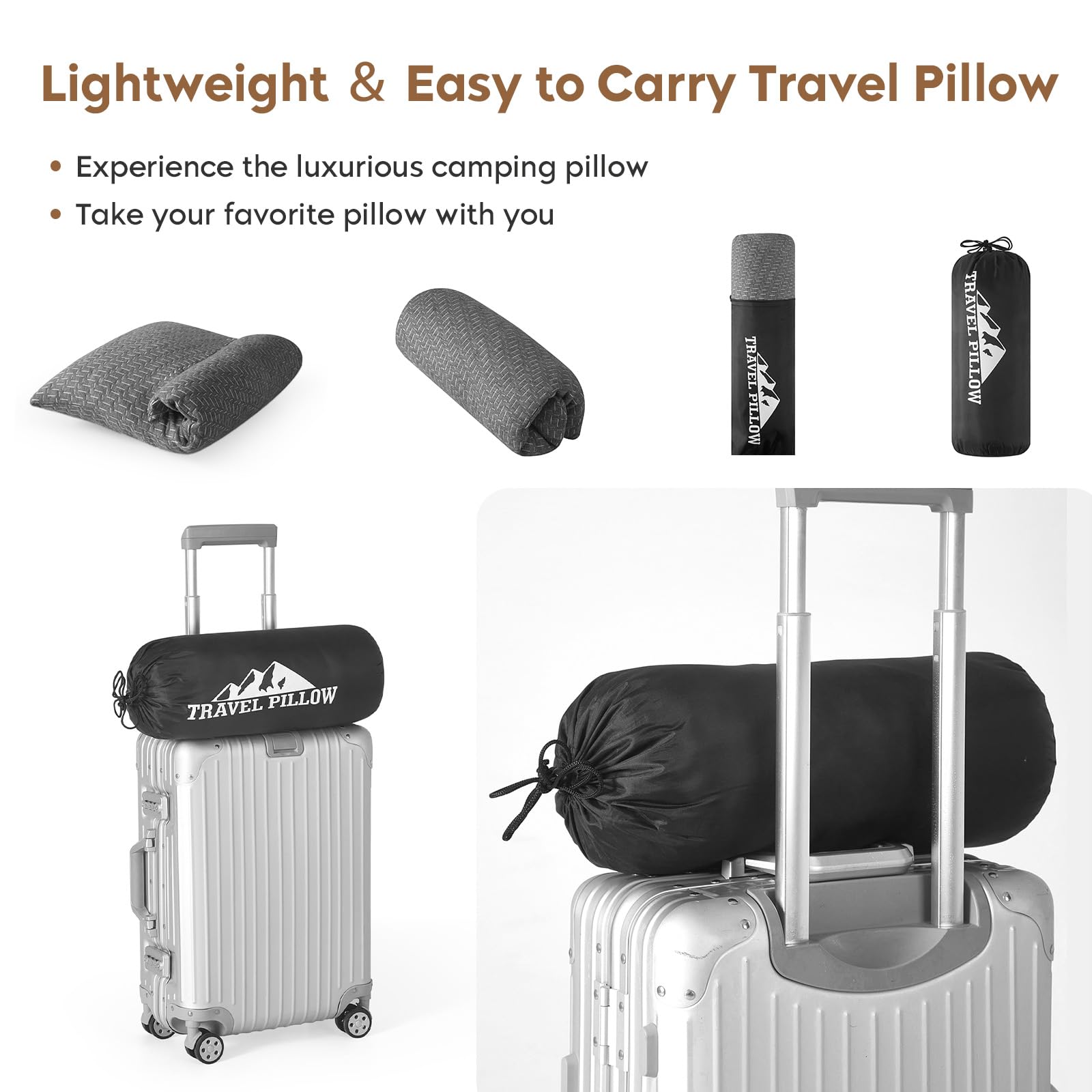 • 【Compact and Portable】PEUJEW camping pillow measures 12* 16 inches in size (Hand-measured product, ±1-2 inch error), featuring a compressible and portable design with a practical travel bag. It easily attaches to luggage or hangs in the car, making it ideal for business travelers, campers, and backpackers