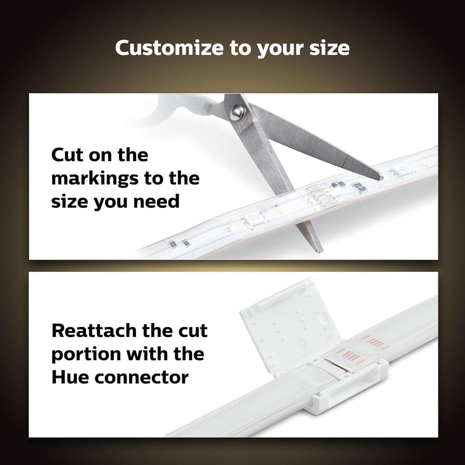 Details: Use this Hue gradient ambiance base kit with your Hue gradient ambiance light strip extension (sold separately) to extend your light strip. Use multiple extensions to extend up to 33 feet. With this color changing light strip you can enjoy a seamless blend of multiple colors of light at the same time in a single LED strip. The colors flow naturally together while casting a diffused rainbow of light to enhance your ambiance and room decor. The light strip has a premium silicone sleeve with a milky white finish and blends in neatly wherever the light strip is placed. The sleeve diffuses the light so that all you see is the beautiful ambiance of light with no harsh reflections. Place your light strips under or above kitchen cabinets, furniture, along a hallway or stairs, or anywhere your imagination takes you. When looking for LED lights for bedrooms, light strips can be placed under a bed to provide the right light for going to sleep or easing into the morning. The flexible design can bend to fit and can be cut or extended. When connected to a base kit you can control up to 10 lights in a room with Bluetooth to instantly set the mood. Add or connect to a Hue Bridge to unlock the full power of Philips Hue smart home lighting, including the ability to control up to 50 lights and accessories, automations, and smart control from anywhere in the world. Pair your light strip with any compatible Amazon Echo or Google Home device for hands-free help in any room, or use Apple HomeKit when paired with a Hue Bridge (sold separately).