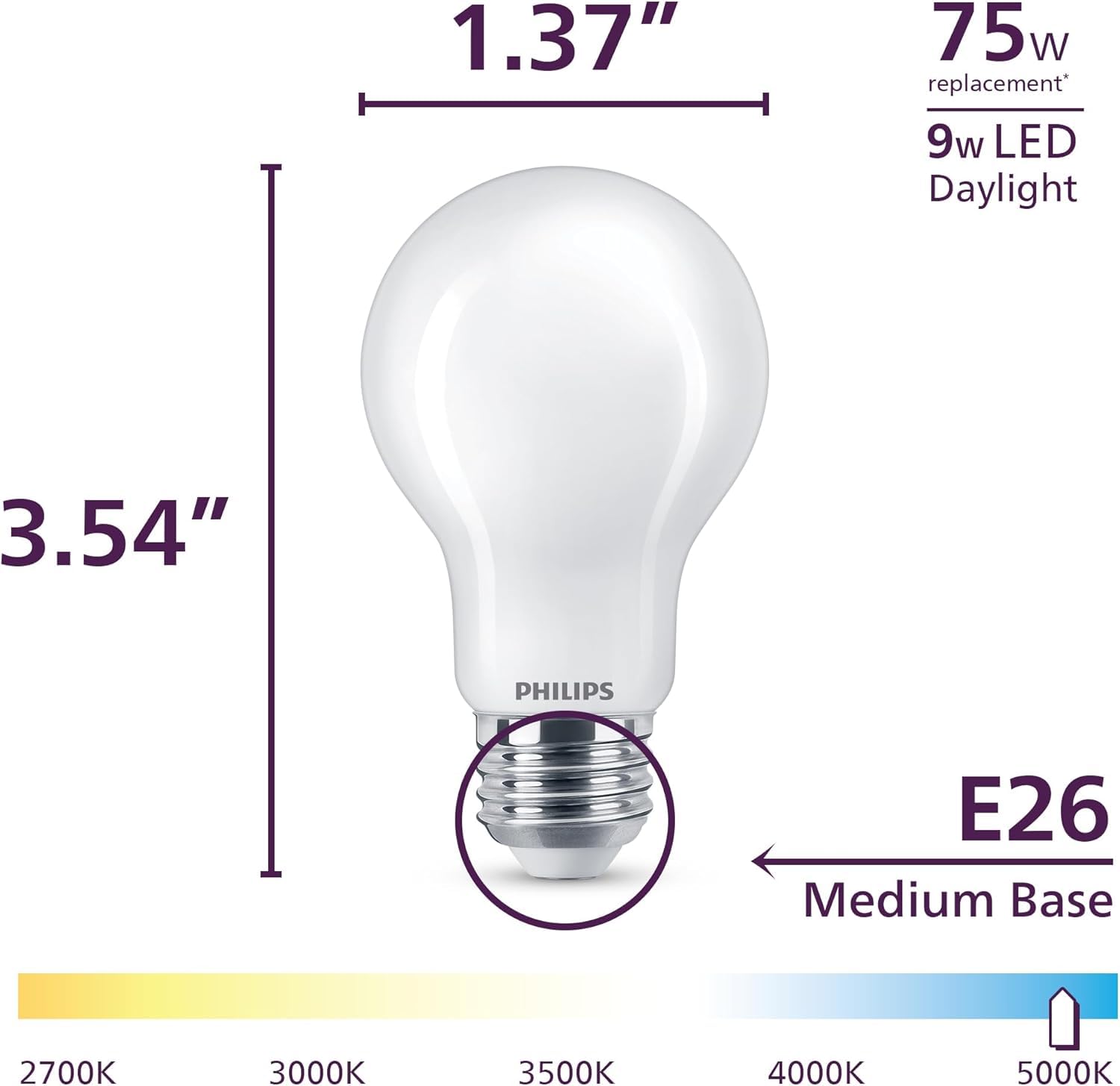 PHILIPS LED 75W A19 4-Pack Ultra Definition Daylight (5000K) 1100 Lumen (9W = 75W) Dimmable Frosted Flicker-Free Light Bulbs
