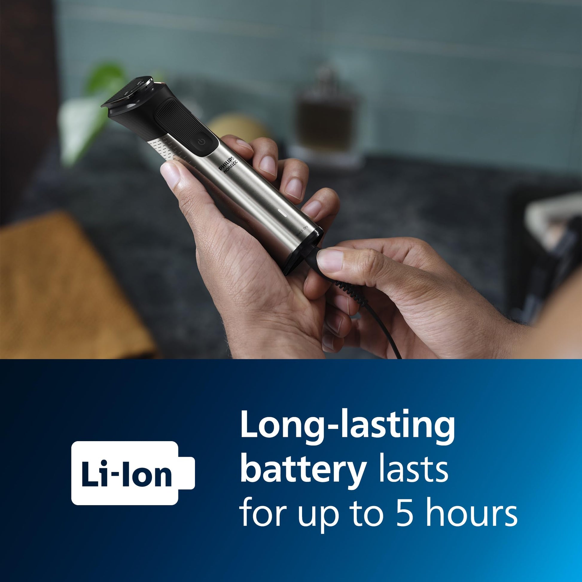Details: The Philips Norelco Multigroom 7000 is the all-in-one trimmer for maximum versatility. It boasts titanium-coated self-sharpening steel blades that never need blade oil, stay as sharp as day one, and don't rust. Create clean, straight lines for a perfect finish and craft your own personal look with a durable hair trimmer for men with 23 quality tools and 20 length settings for styling your face, hair, head and body, including below-the-belt grooming. The precision trimming comb offers 11 length settings between 1-3 mm. Plus, the 3-7mm adjustable comb provides even more grooming options for a personalized look. With the nose and ear hair trimmer attachment, you can easily remove unwanted nose and ear hair. The Multigroom 7000 also has BeardSense technology to boost power exactly when you need it to tackle dense, bushy, or long beards. The long-lasting lithium-ion battery provides up to 5 hours of runtime for long life and maximum power. The steel frame and rubber grips deliver superior control. For easy cleaning, remove the heads from the handle and rinse them under the tap. The grease found as you remove the trimmer head is there to ensure consistent trimming performance over time, so you’ll have a trim that’s as smooth as day one. USB-A charging cable included (wall power adapter not included).