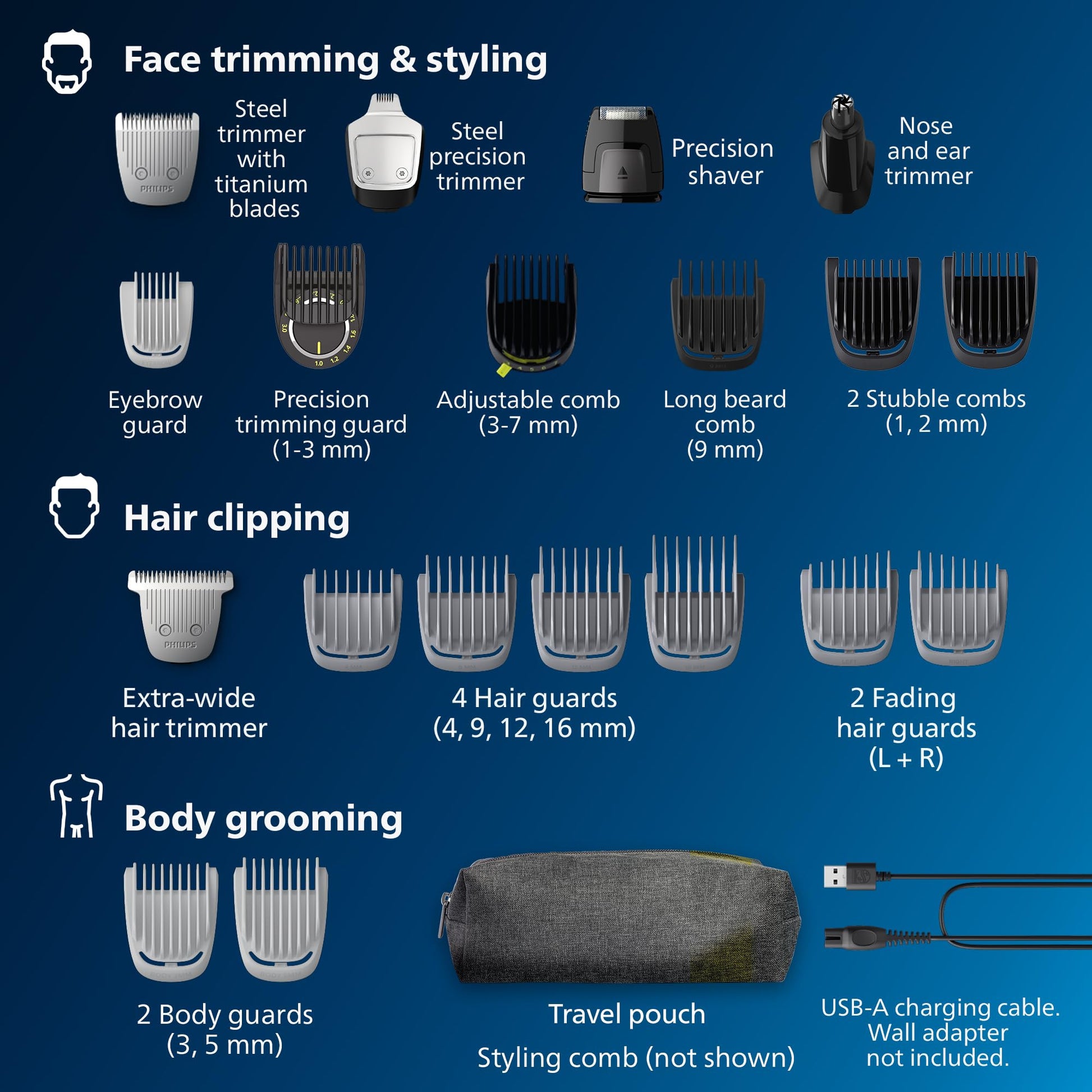 Philips Norelco Multigroom 7000 Series, All-in-One Trimmer, Beard Trimmer and Hair Clipper, 23-Piece Men's Grooming Kit for Beard, Face, Nose, Ear, Body, with Titanium Blades, Travel Pouch, MG7970/49