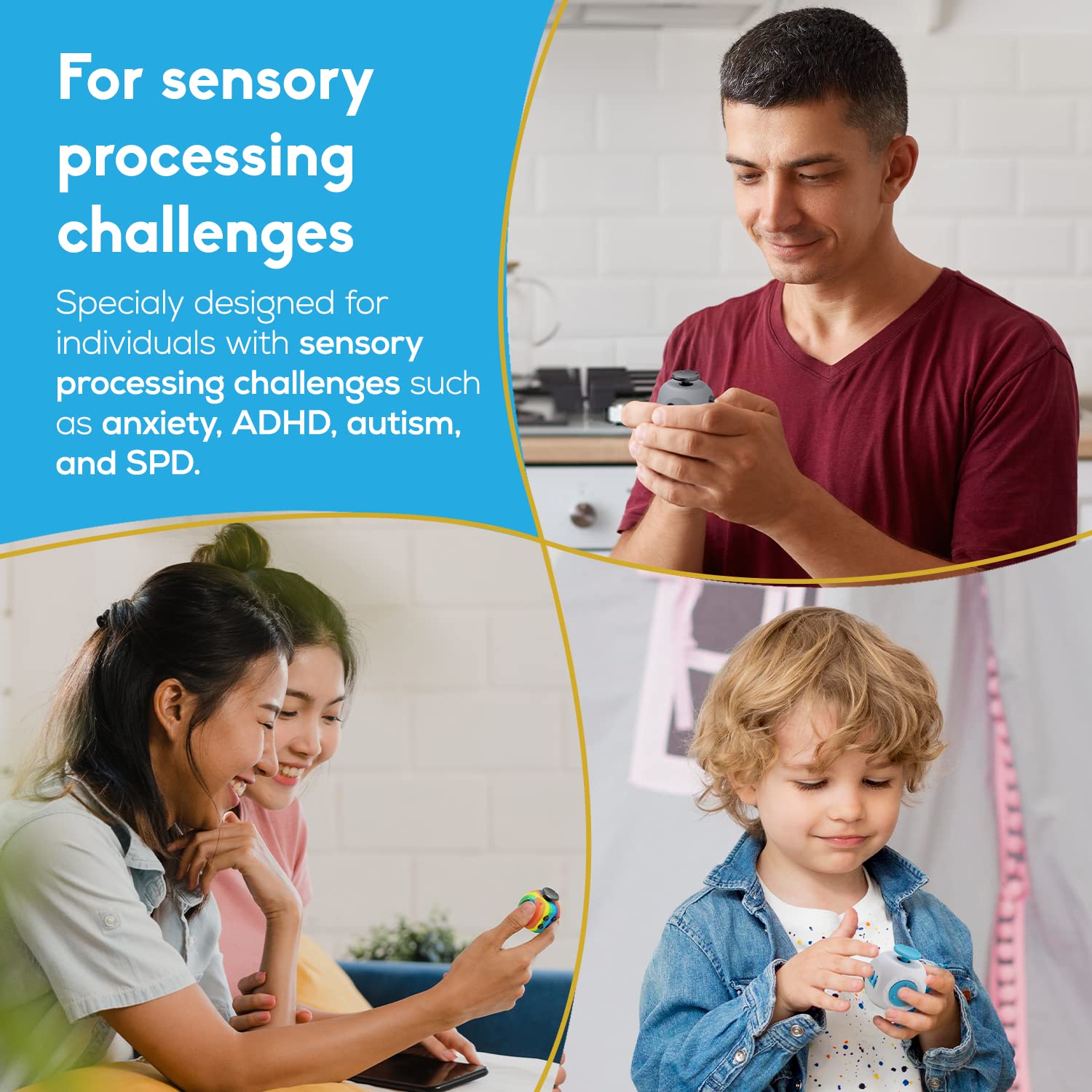 • DESIGNED FOR SENSORY CHALLENGES: We designed our fidget cube for adults & kids with sensory sensitivity. Our fidget cubes help enhance focus, relieve feelings of unease, and assist people looking to break bad habits like smoking & nail-biting. A perfect choice as stocking stuffers for kids who need calming, sensory support.