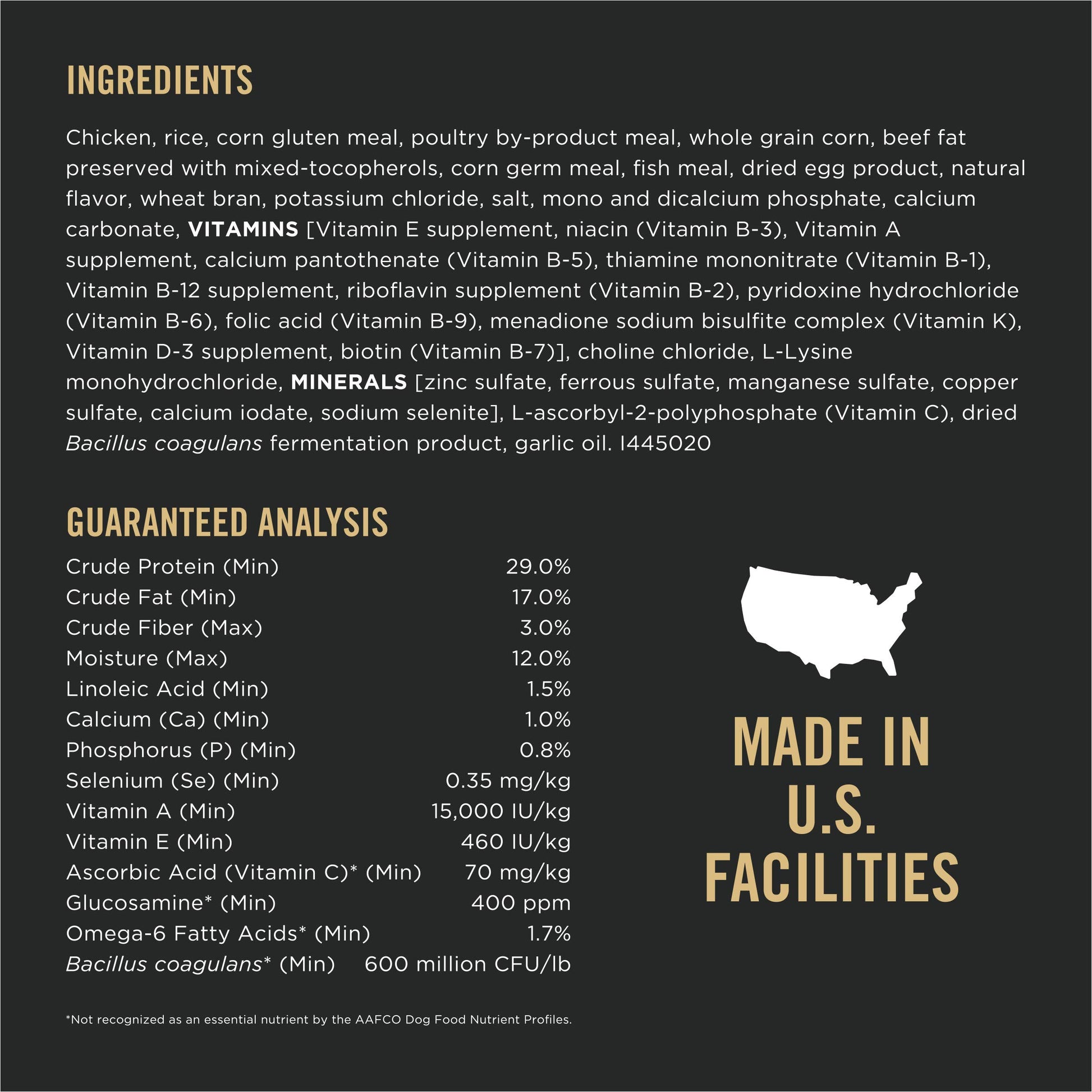 Details: Give your small dog specialized nutrition with a taste he will love with Purina Pro Plan Brand Dog Food Small Breed Chicken and Rice Formula adult dry dog food. Real chicken helps provide protein, which is an essential building block within your dog's body. Including chicken as the first ingredient, this formula is high in protein to meet the unique needs of your active small dog. This super premium dog food features bite-sized kibble that's nutrient dense to meet your dog's needs, and the natural prebiotic fiber sourced from wheat bran helps to promote his digestive health. You can enjoy daily walks and playtime in the backyard when you know that the calcium, phosphorus and other minerals in this kibble help to maintain his strong teeth and bones. We also fortify this small breed dog food with guaranteed live probiotics for digestive and immune health. Watch as he enjoys every crunchy bite of this Purina Pro Plan SPECIALIZED formula designed to meet his nutritional needs.