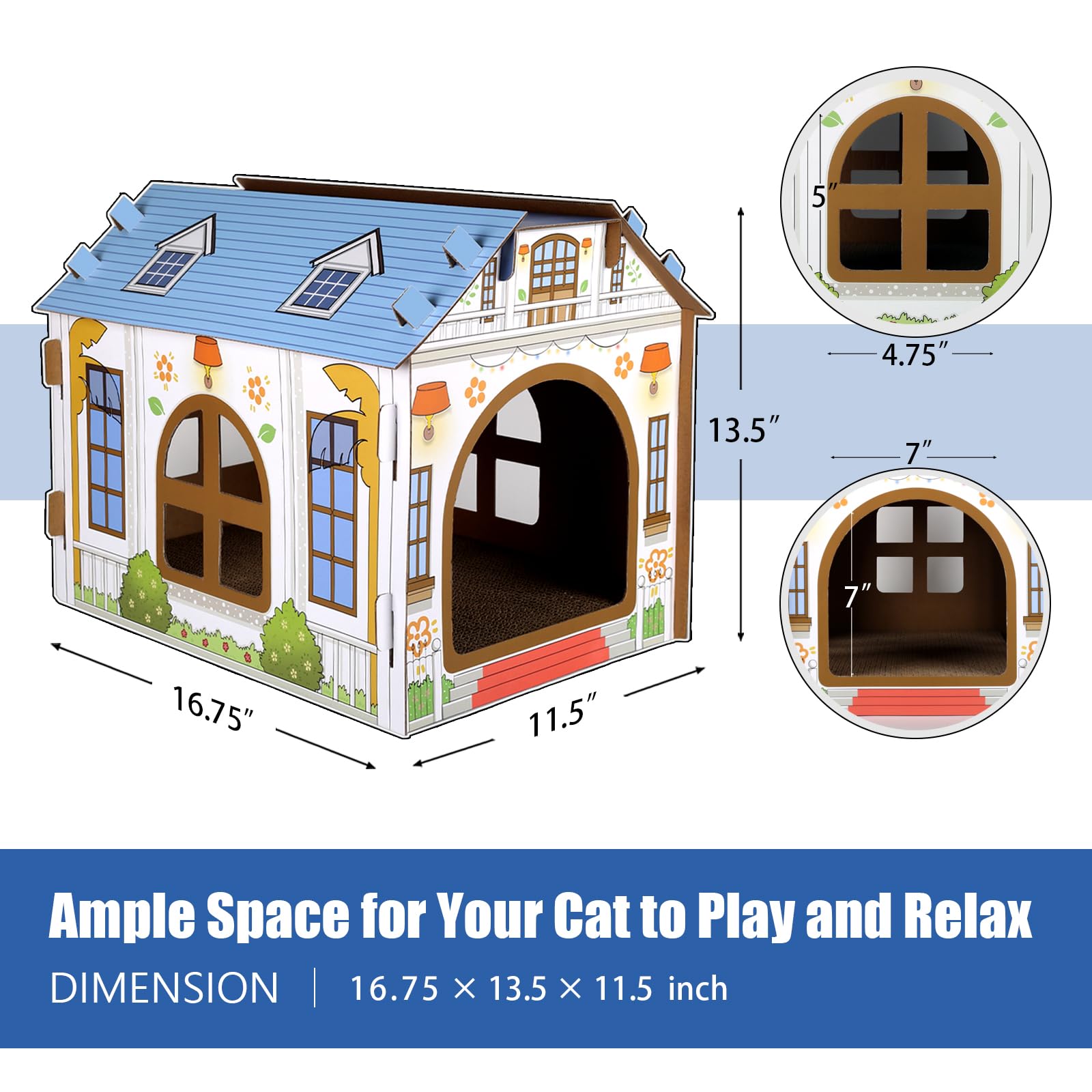 • [CAT HOUSE & SCRATCHER 2 IN 1 DESIGN]: 2 in 1 cat getaway villa, this cat cardboard house is not only a cat playhouse for resting and napping, but also a cat scratcher board for exercising and playing. The scratcher house provides a hideaway place for your cats to play and rest. The removable corrugated scratcher board helps to promote paw health and fulfill your cat's natural instincts and provide enrichment in your home.
