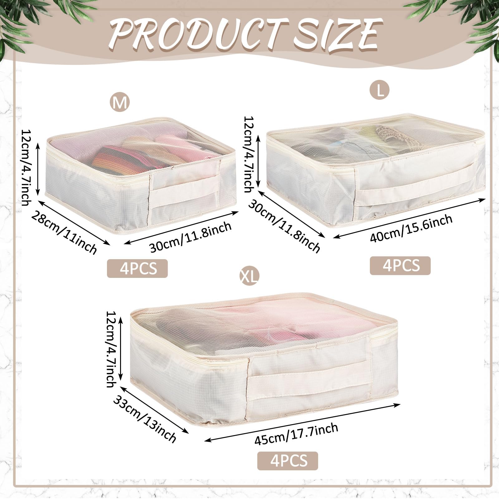 • Meet Your Daily Needs: you will receive 12 pieces of luggage organizers for suitcase, including 4 pieces of extra large size bags (17.7 x 13 x 4.7 inches/ 45 x 33 x 12 cm), 4 pieces of large bags (15.8 x 11.8 x 4.7 inches/ 40 x 30 x 12 cm) and 4 pieces of medium bags (11.8 x 11 x 4.7 inches/ 30 x 28 x 12 cm); One set can meet your daily luggage packing need