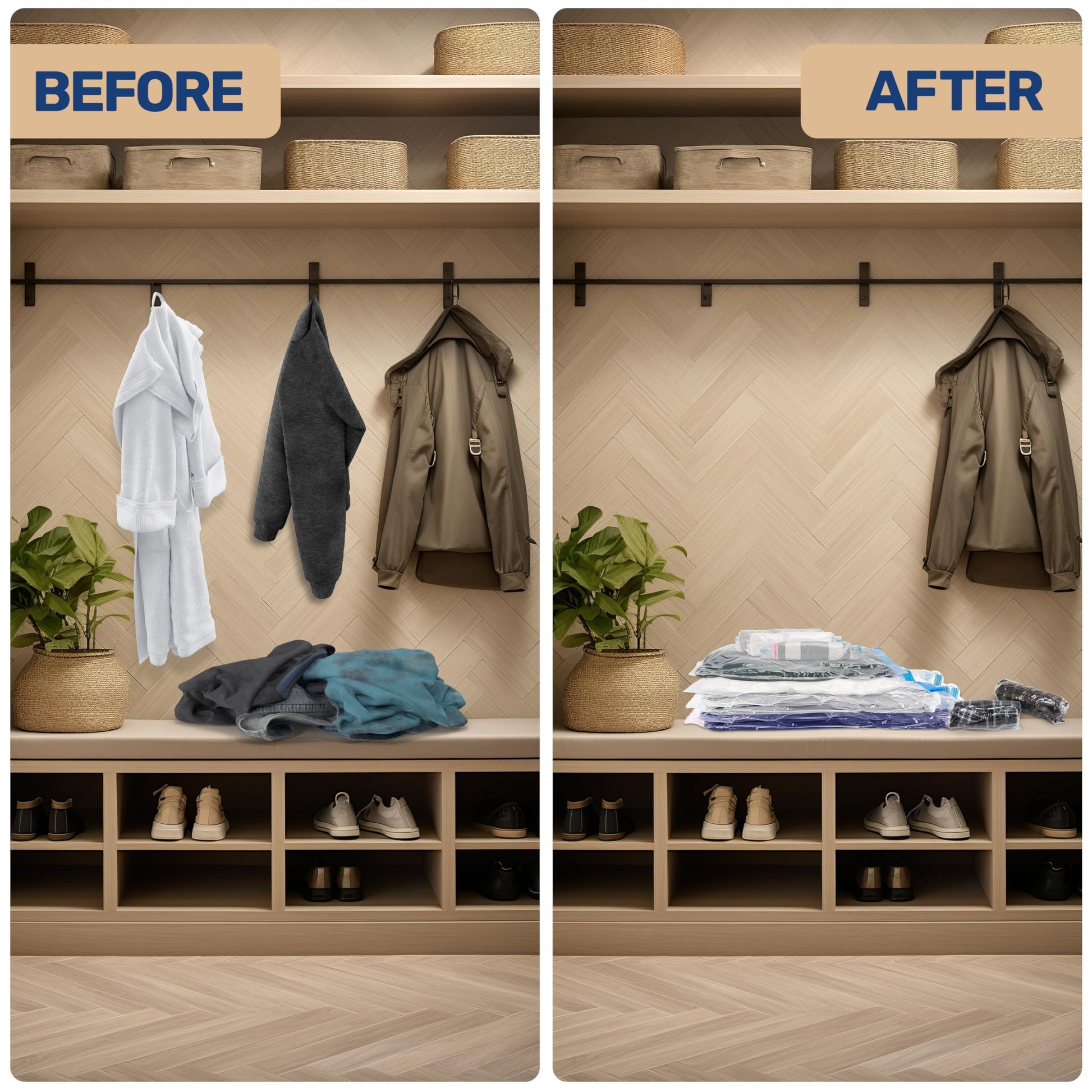 • Save Space: Easily create 80% more space; Store away your comforters, blankets, duvets, towels, clothes, pillows, plush toys, linens, bedding, and more.
