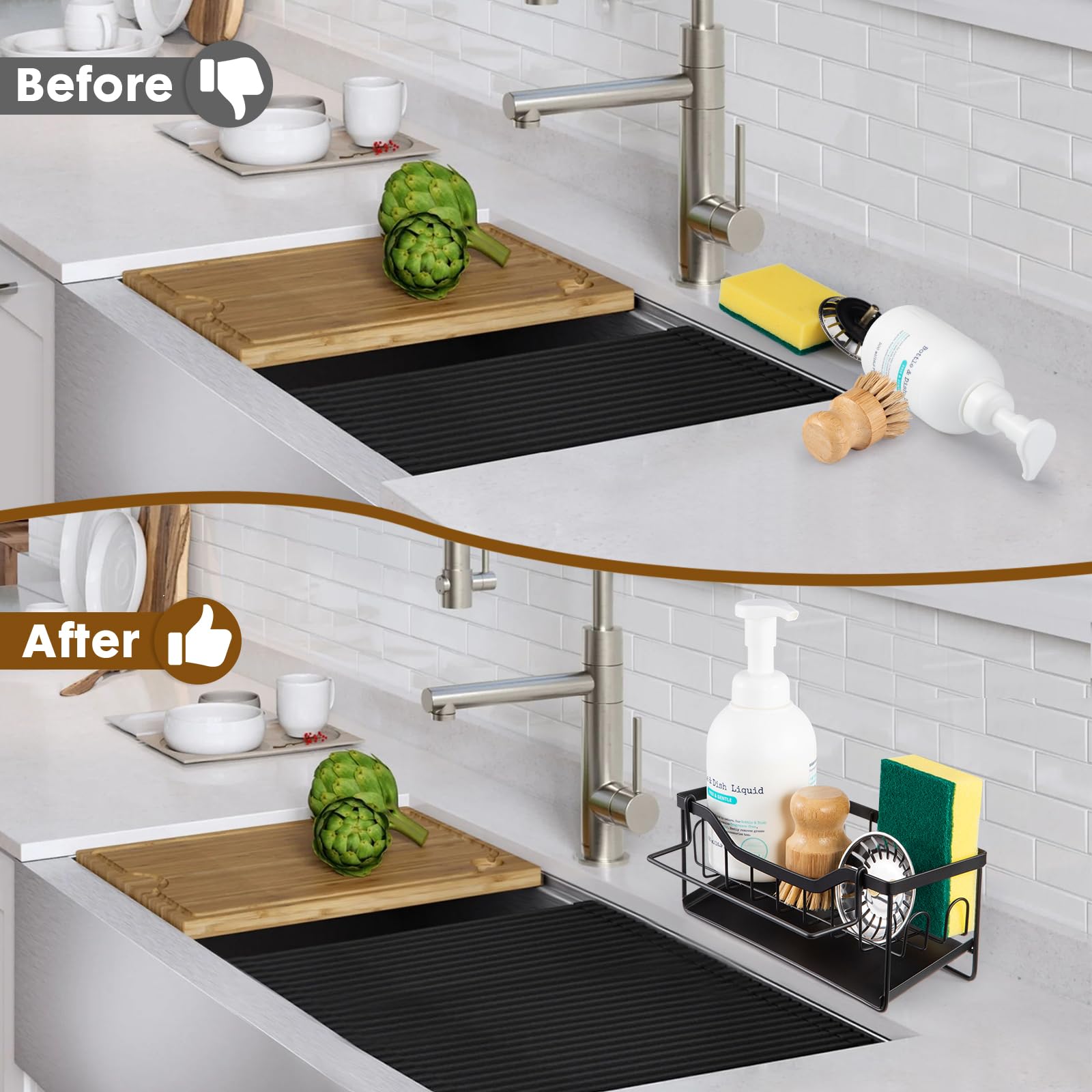 • ✅【Premium Stainless Steel Material】The kitchen caddy sink basket organizer uses 304 stainless steel, rust resistant, waterproof, anti-fingerprint, strong and durable material to make the dish sponge holder has better bearing capacity, which will still look new after long-term use.