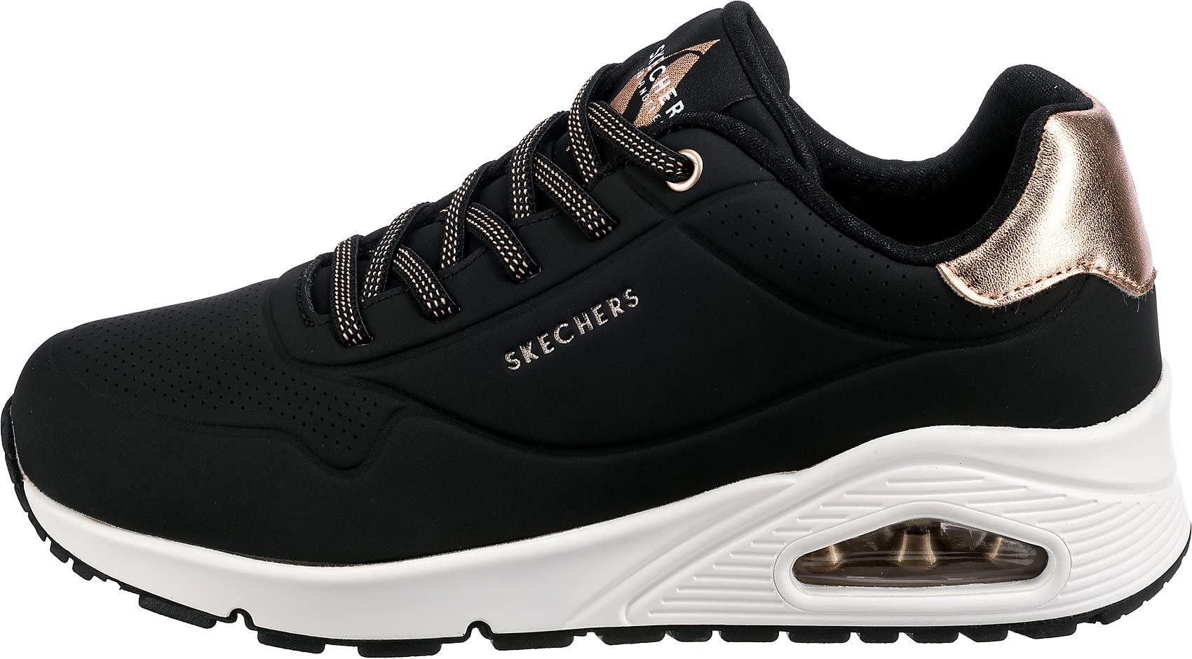 Slip-on a classic style in comfort wearing Skechers Street™ Uno - Shimmer Away. This fashion sneaker features a synthetic durabuck upper with a metallic trim, stretch laces, Skechers Air-Cooled Memory Foam® insole and Skech-Air® visible air-cushioned midsole.