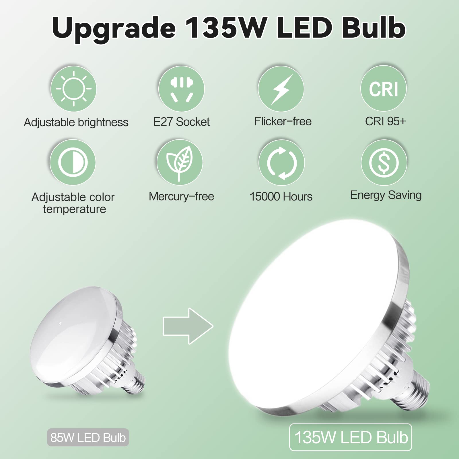 • Updated 135w LED Bulbs: 3-color dimmable LED bulbs, color temperature 2700-6400K and brightness 1-100% adjustable by remote control. Brighter and environment-friendly without mercury. Total power equivalent to 1350W regular incandescent bulb, energy saving up to 80% and service life of about 10000 hours