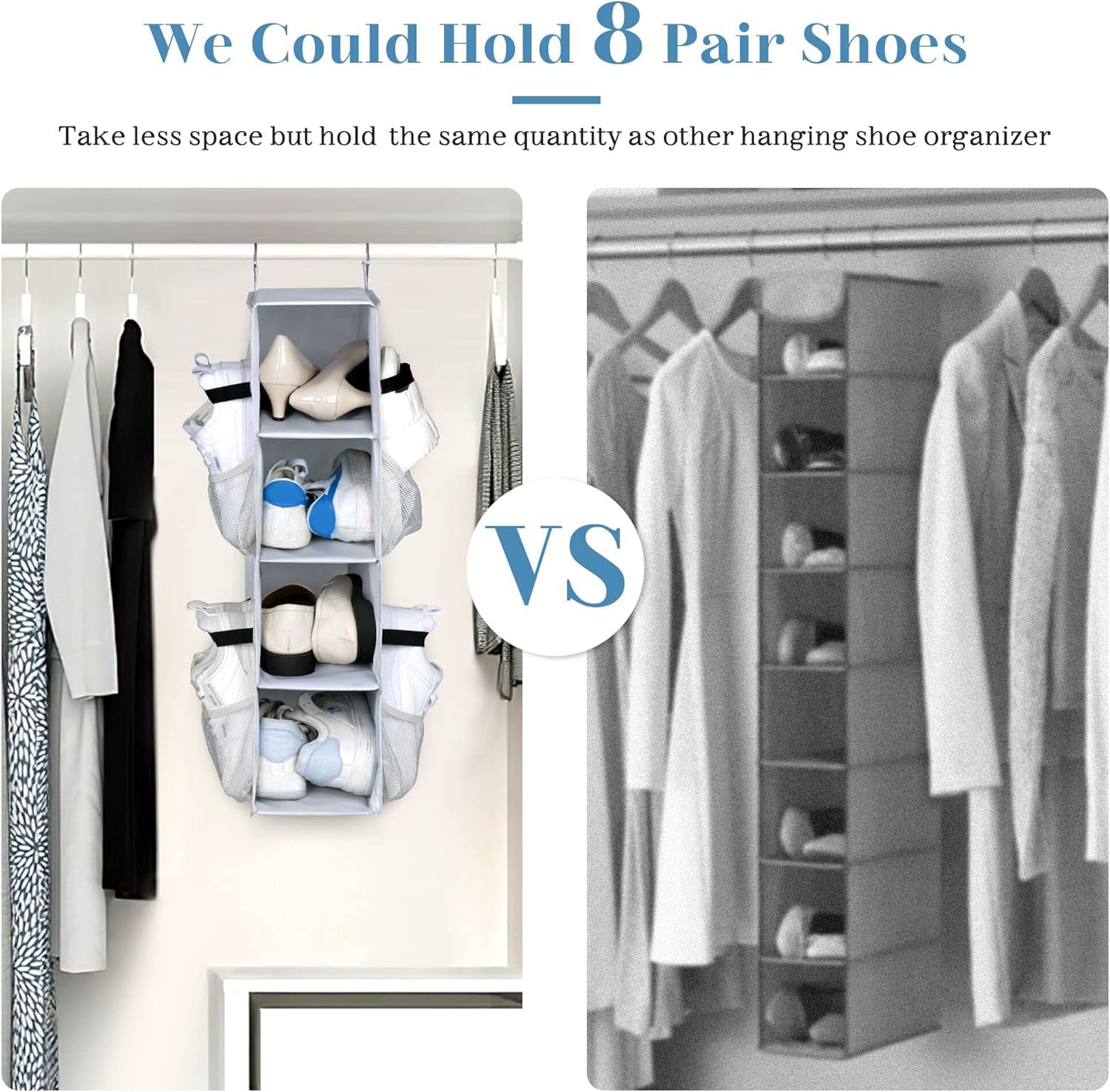 • 【Shorter Hold More】- With 4 mesh pockets and 4 deep shelves so that you can orderly store 8 pairs of shoes with easy access which have the same storage capacity as other long shoe holder and eliminates clutter of shoes;