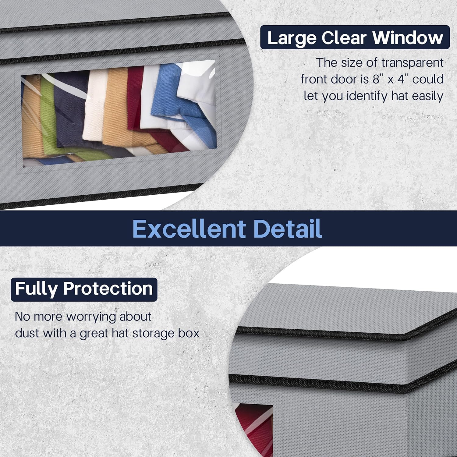• The hat storage for baseball caps come with study hard cardboard on the lid, bottom and all sides so that you can stack them together in closet shelves. Hat box could protect your caps from dust and ensure your hats remain in pristine condition;