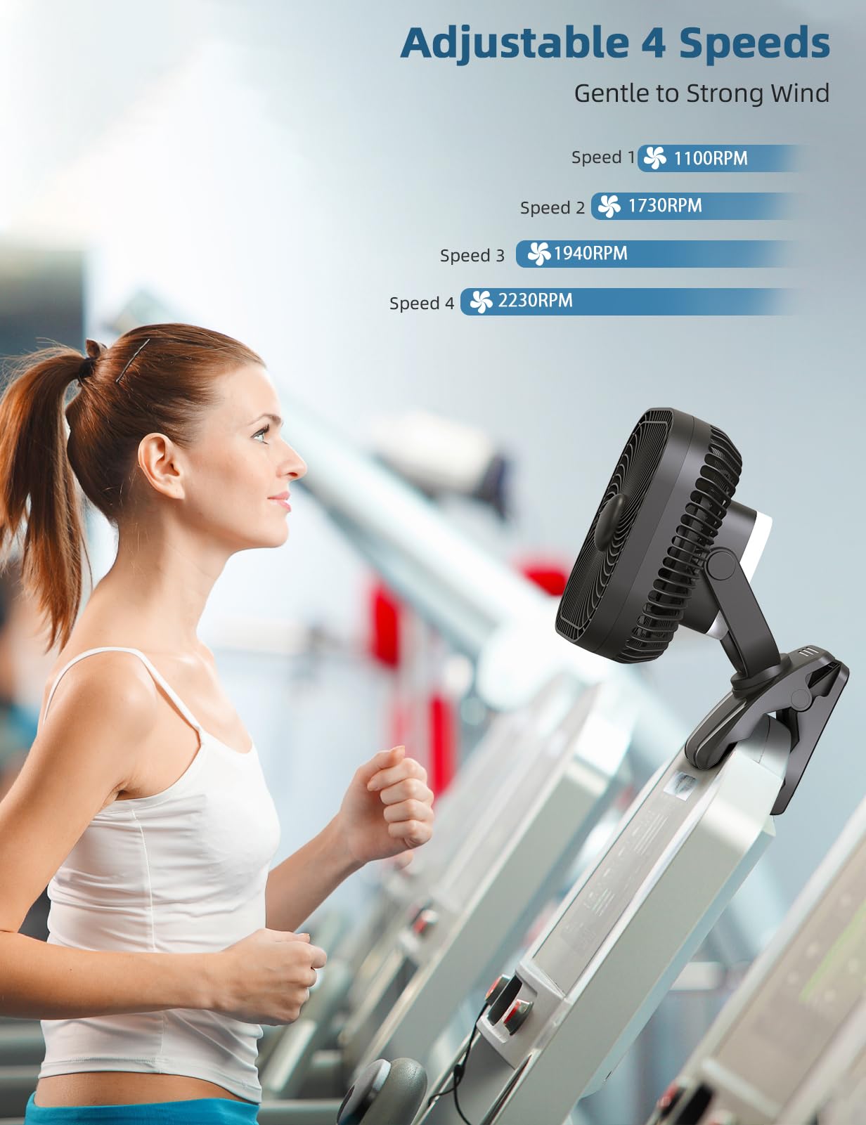 • 【Hook Design】This camping fan has a built-in hook, you can hang it on the tents, branches or inside a car. You also can simply placed it on desk at home or in office. It also has a sturdy clip with which you can attach the fan to treadmills, toddler’s car, outdoor camping umbrella, or even golf cart.