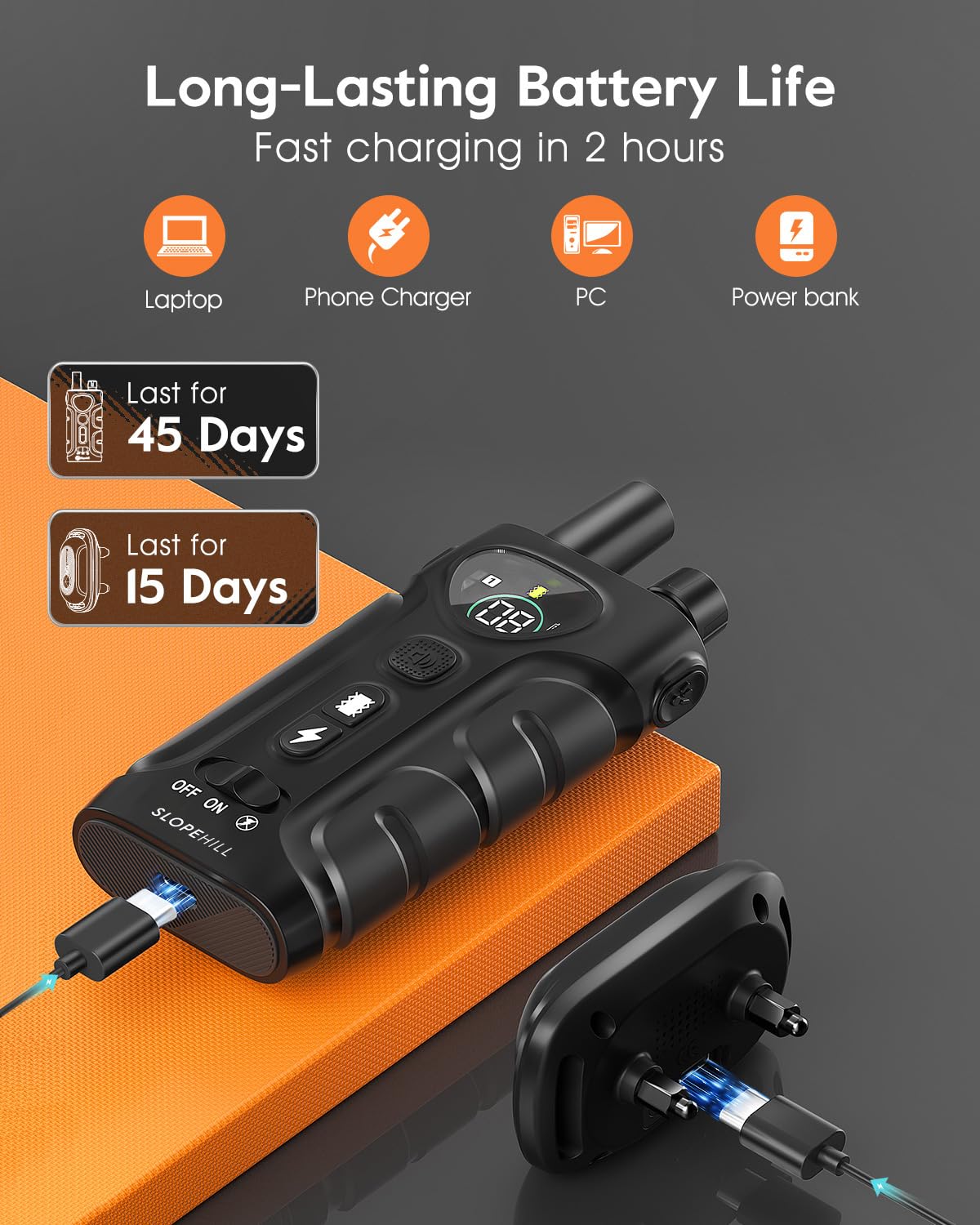 • 【5 Humane Training Modes】SLOPEHILL upgraded dog shock collar with Beep, Vibration, Safe shock, Flash Light ,No Shock modes, you can use it to teach a dog basic commands and solve an uncontrollable dog's behaviour problem,Which can improve your dog’s behavior at home or in social settings and enhance the feeling with your friends