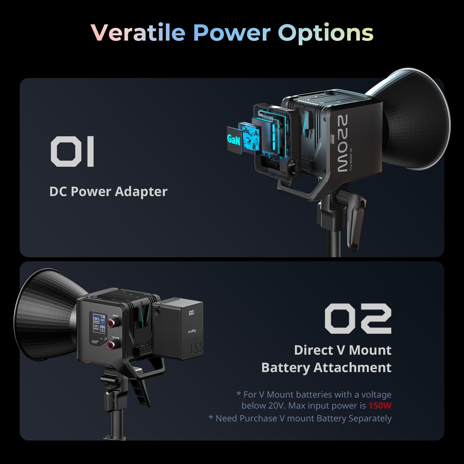• Versatile Power Options: The RC 220B Pro light supports various charging methods. For wireless charging, The light body has a built-in V-mount, which supports V-mount battery charging; and supports NP-F970 batteries(requires NPF adapter). For wired charging, A power adapter (Included) is available. Note: Only the compatible interfaces powered by; the charging devices mentioned are not provided.