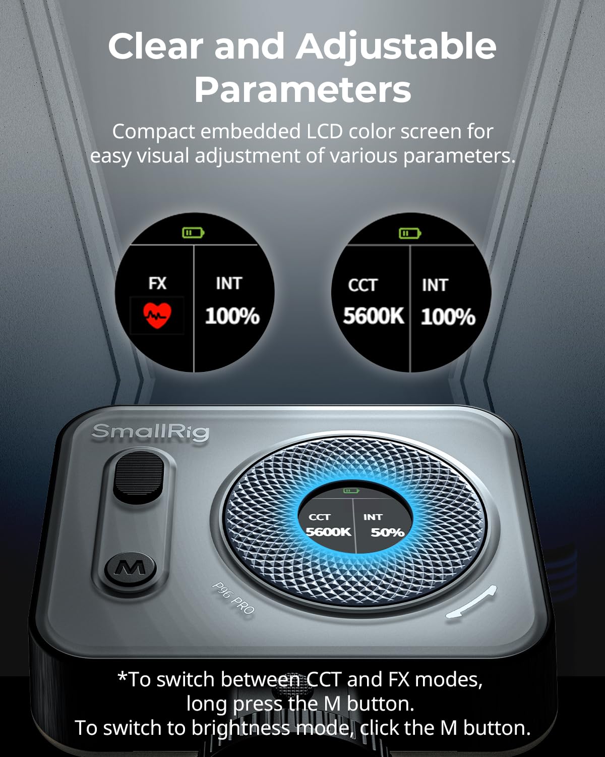 • 【New Upgrade】Vibe P96 Pro is the 2nd-generation product in SmallRig's Vibe LED Light series. Inheriting the iconic ring-shaped metal stepless knob design, it now features an embedded LCD color screen for a clear display of parameters such as color temperature and brightness, allowing for easy single-handed adjustment.