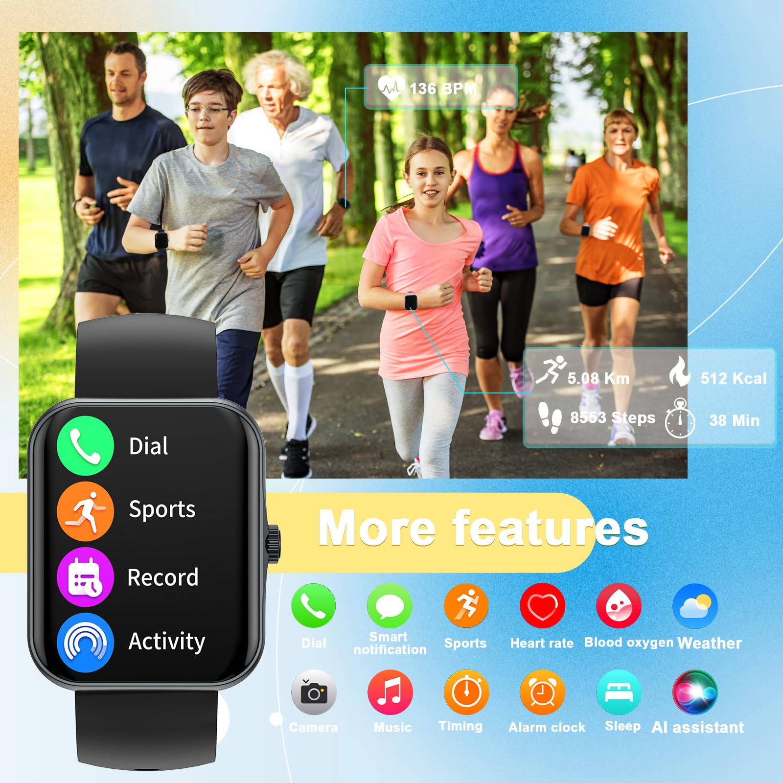 • ✅Multifunctional Sports Smart Watch: Has Bluetooth calls, calories, 37 sports modes, alarm clocks, women's health, weather, camera control, timer, stopwatch, music control, fitness tracker, heart rate, blood oxygen, sleep, sedentary reminder reminder , Voice Assistant, SMS or SNS notification (WhatsApp, Facebook, Instagram, etc.). Make your life healthier, and work more efficiently. It is to give gifts to yourself, children, lover, family and friends.