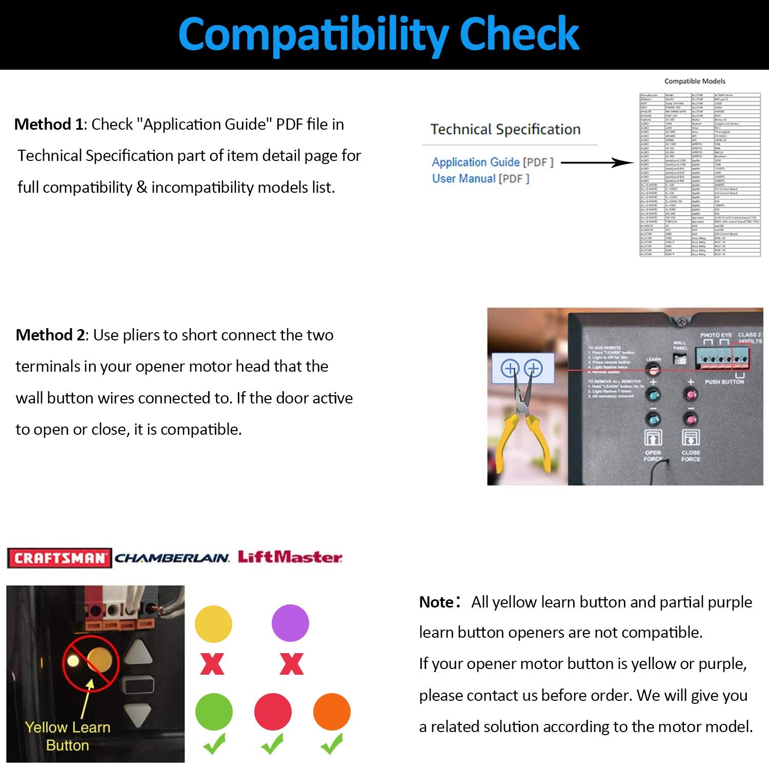 • PLEASE TEST COMPATIBILITY BEFORE ORDER by taking a wire with both ends stripped or a straightened-out paper clip and put each end to the same terminals as the wall button wires are terminated to. If the door closes or opens, this smart controller will work with your garage door opener. Or you can also check 'Application Guide' PDF file in Technical Specification part of item detail page for full compatibility & incompatibility model lists.