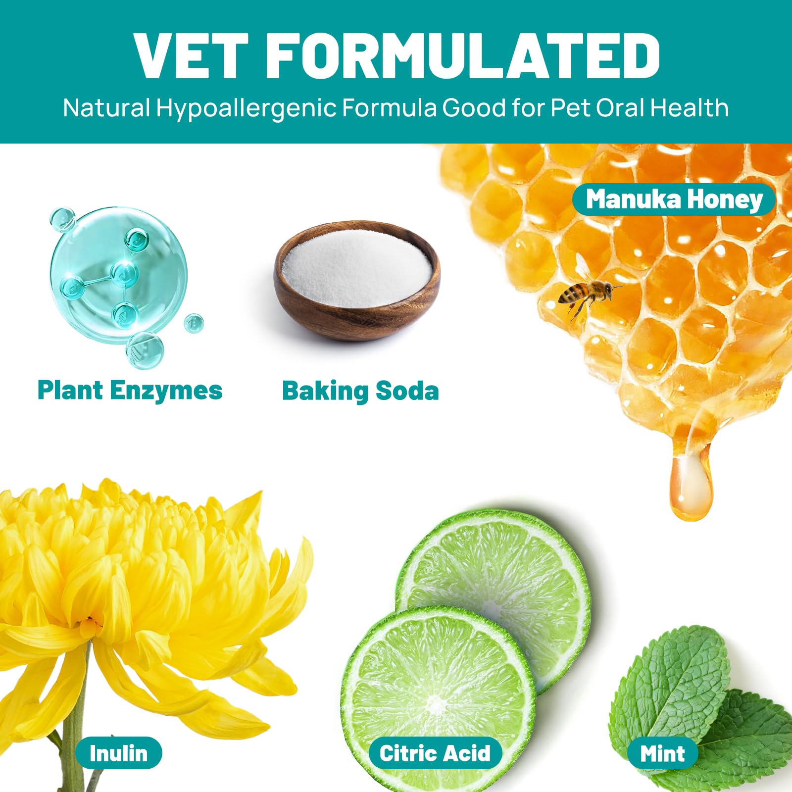 • Safe and Natural Ingredients: Our unique formula includes EDI purified water, plant enzymes, baking soda, tea polyphenols, inulin, Manuka honey, and citric acid. This innovative blend is alcohol-free, devoid of parabens and fragrances, making it safe even if licked or ingested. Perfect for pets with sensitive teeth, gums, and enamel.