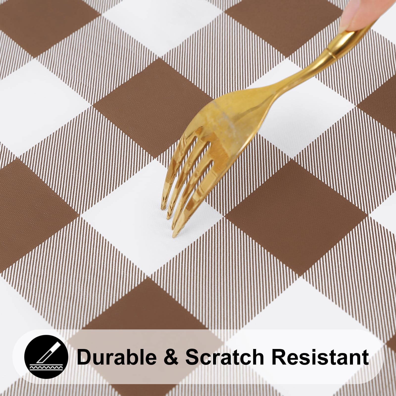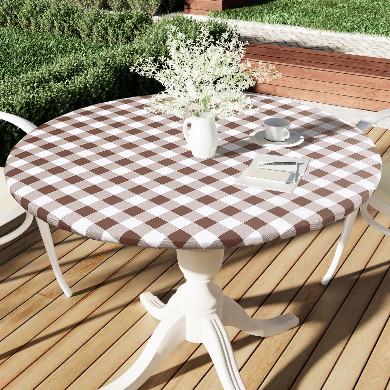 Smiry Round Picnic Tablecloth, Elastic Waterproof Fitted Vinyl Tablecloths for 45"-56" Tables, Flannel Backed Buffalo Plaid Table Cover for Dining, Camping, Outdoor, White and Brown