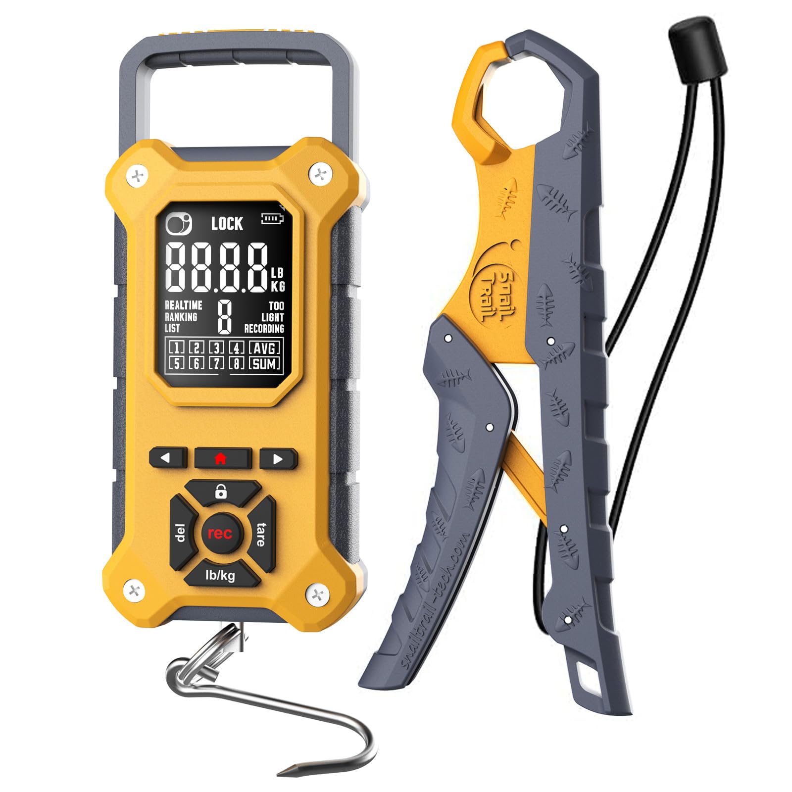 SNAIL TRAIL 8 Storage Bins 50 lbs Digital Fish Weighing Scale & 7.5'' Lip Gripper, Bass Fishing Tournament Culling, Hand Held Travel Items, Electronic Hanging Weight Machine for Luggage, Suitcase, Bag