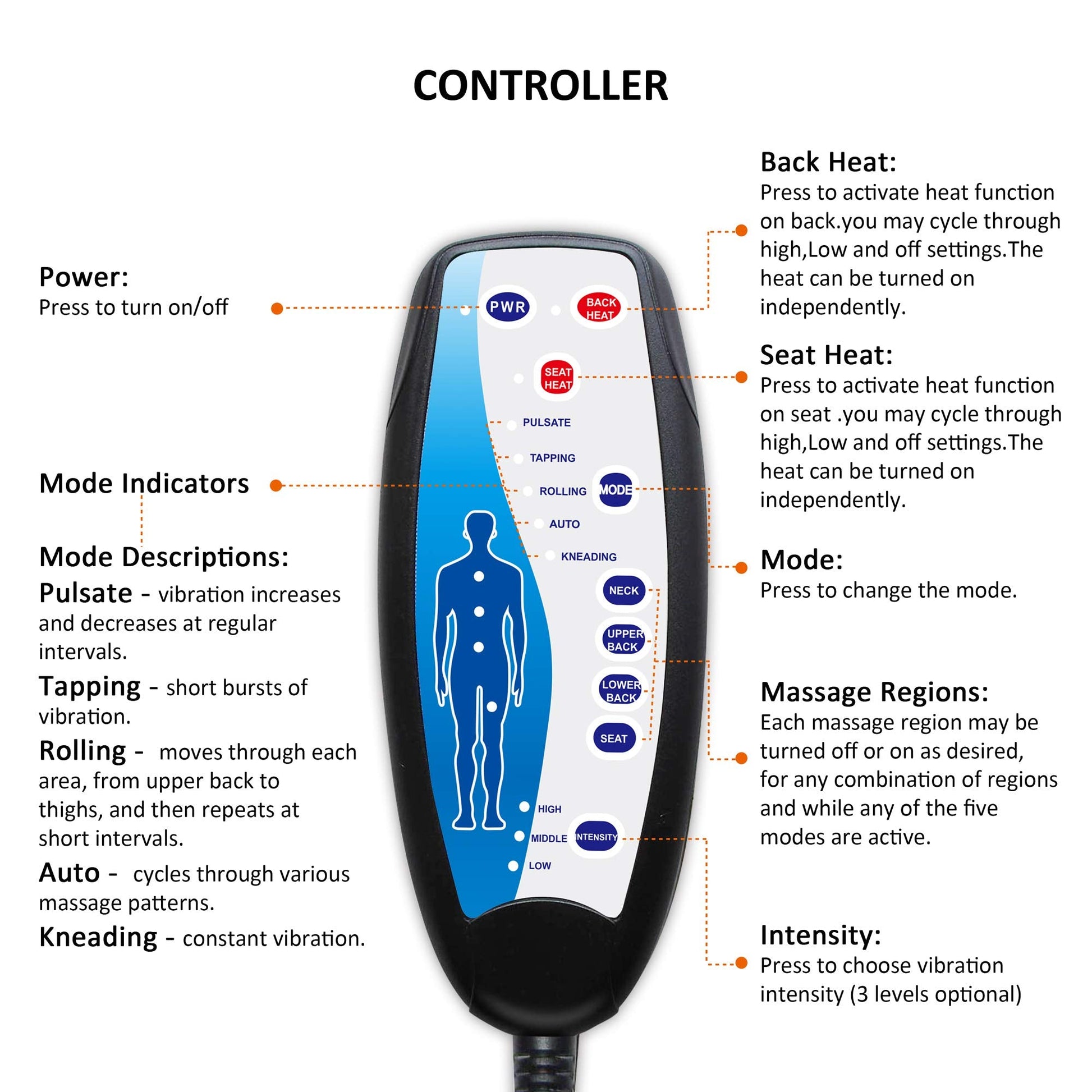 • Custom Setting - The chair massager allows you choose massaging area: Neck,Upper back,Lower back,Seat, combines all of these areas together, all-inclusive 5 programmed modes and 3 variable massage intensities to give you the best massage you can customize.