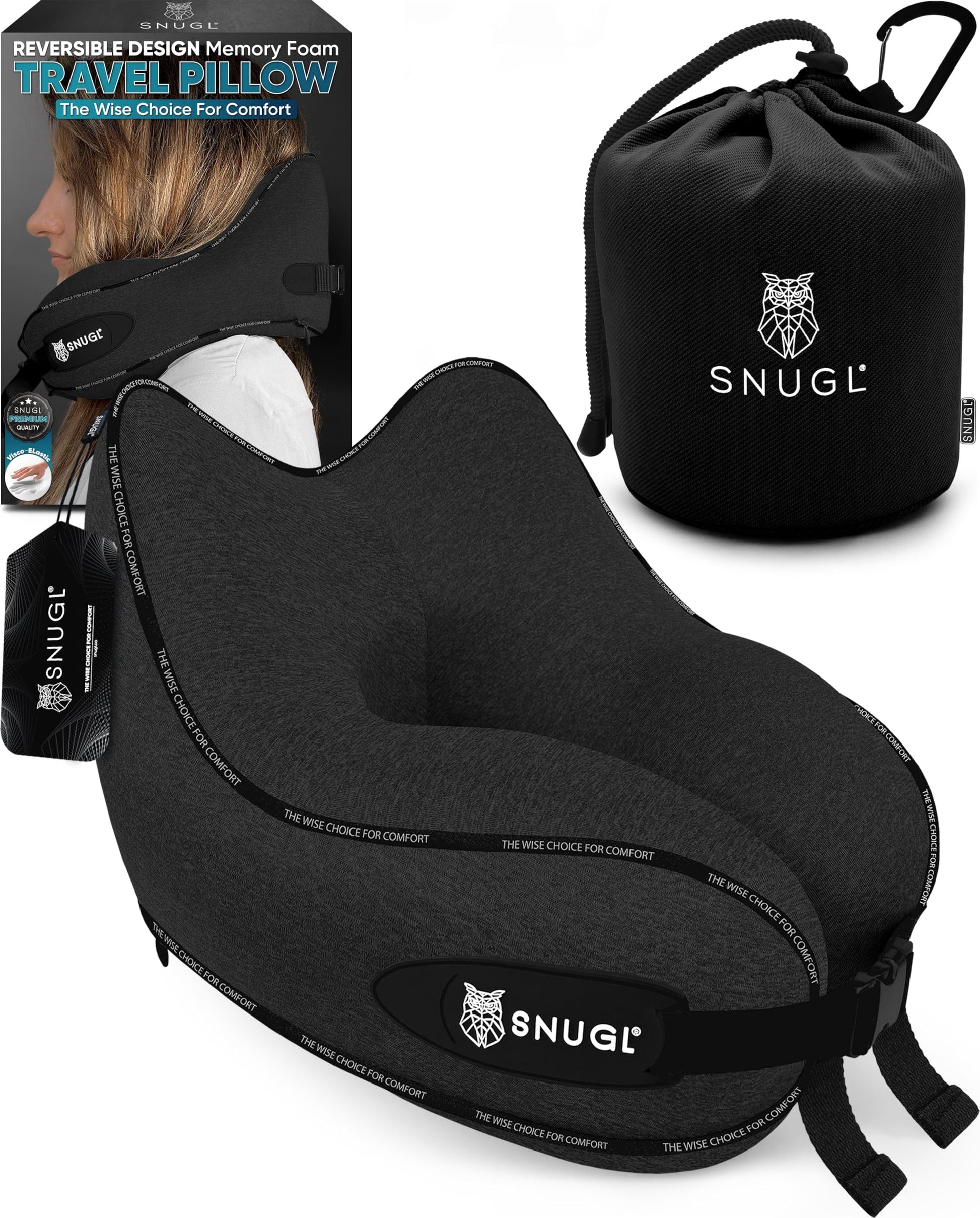 SNUGL Travel Pillow – Memory Foam Pillows - Neck Pillow for Airplane with Carry Bag & Clip – Neck Support Pillows for Pain Relief - Airplane Travel Essentials (Adult Regular - Black)