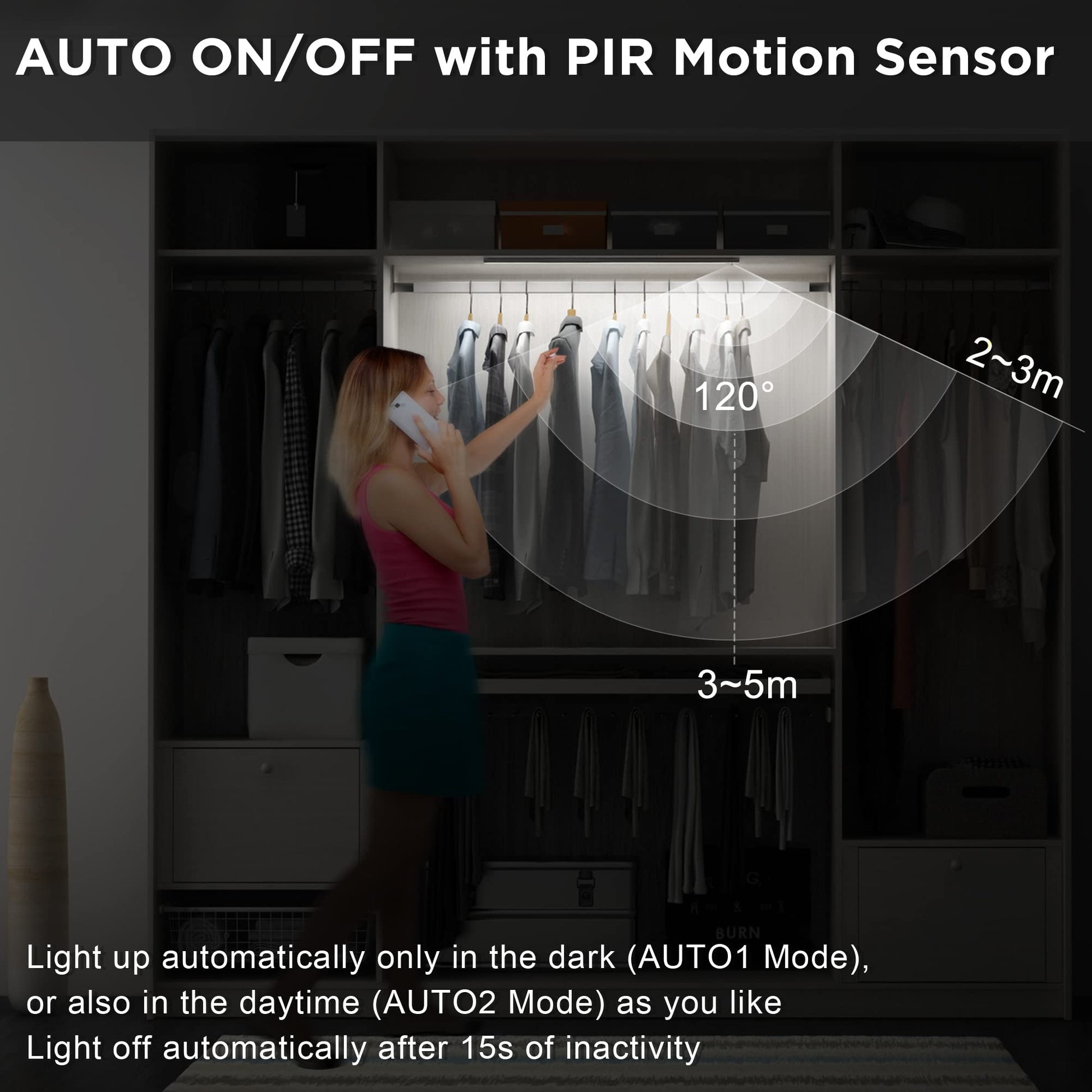 • 3 operating modes: ON/AUTO1/AUTO2: ON mode: as continuous light, can be switched on/off by briefly pressing the round button. Auto motion sensor mode: when motion is detected - only in the dark (AUTO1 mode) or even in daylight (AUTO2 mode) - the light turns on automatically and ensures a pleasant and even illumination. After approx. 15 seconds, the lamp turns off automatically when no movement is detected.