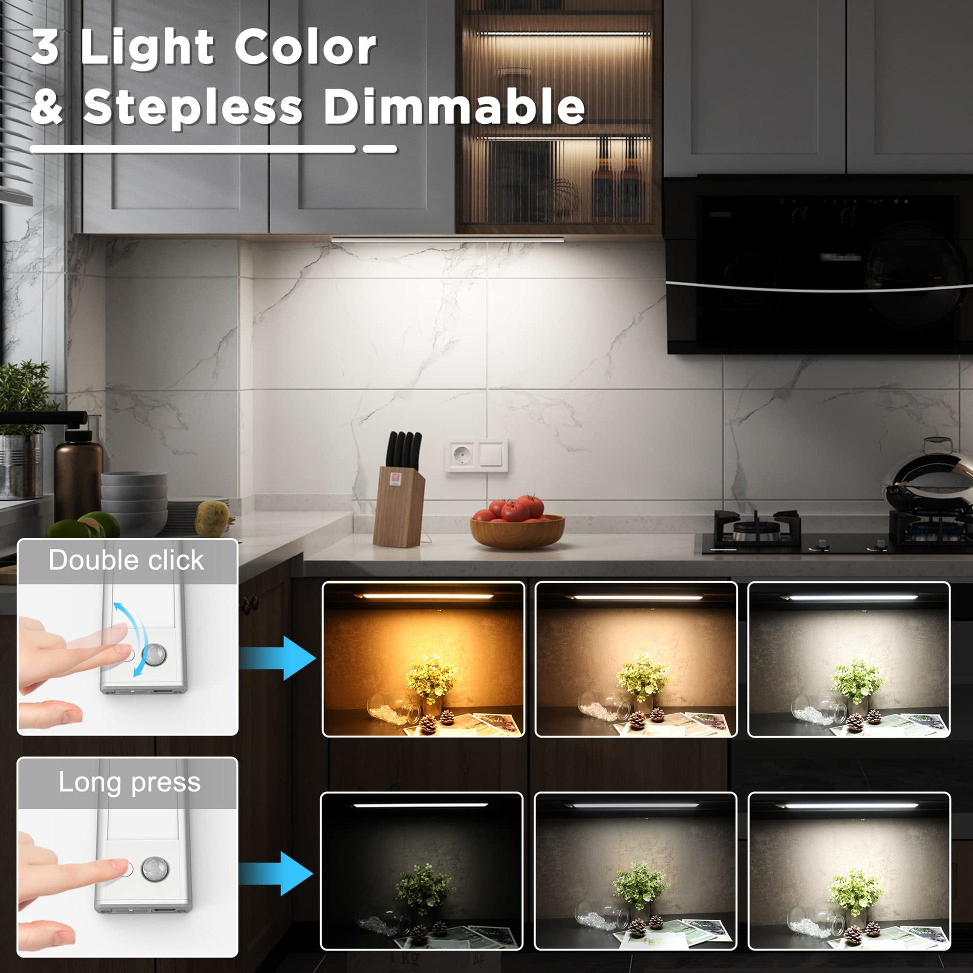 • 💡Brightness and light heat can be adjusted greatly: 3 colour temperatures (cool white/warm white/neutral white) change by double-clicking the round button; if you want to dim/brighten the light, simply hold down this button. By memory function, the cabinet light remembers the last set light intensity and light colour the next time it is switched on.